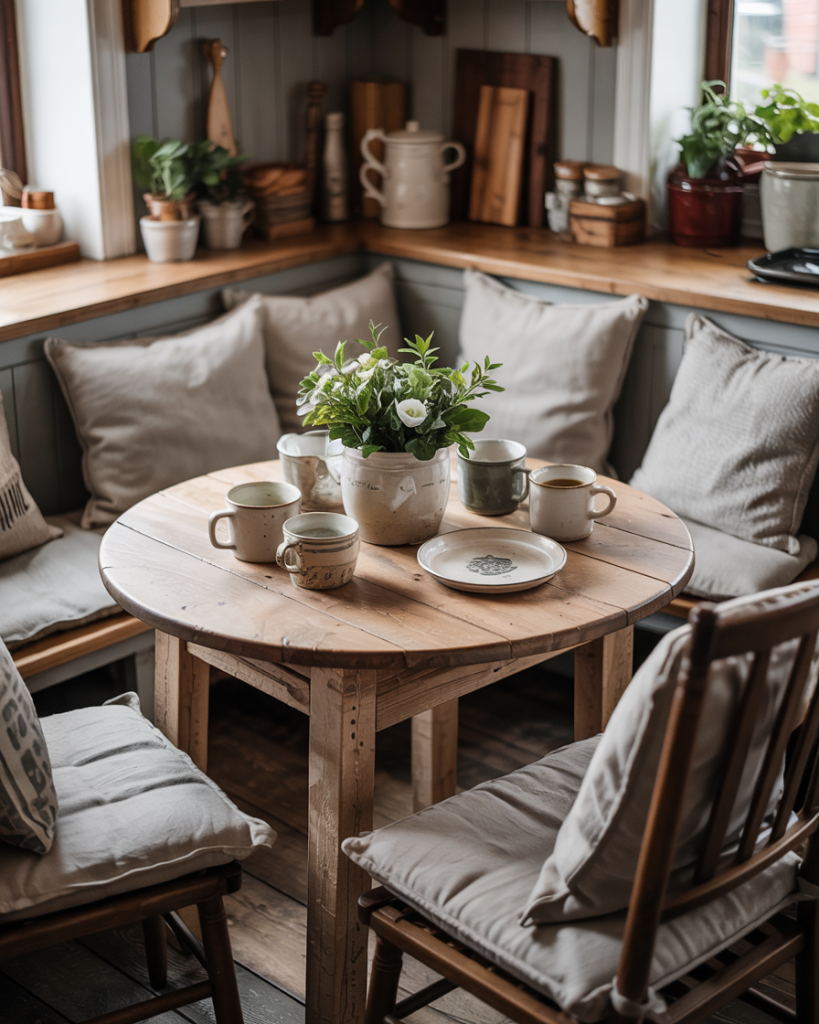 A built-in nook with cushions and vintage tableware turns an unused corner into the heart of the kitchen. Add beige or linen seat covers, mismatched mugs, and a small farmhouse table. The result feels cozy, personal, and perfect for morning coffee rituals.