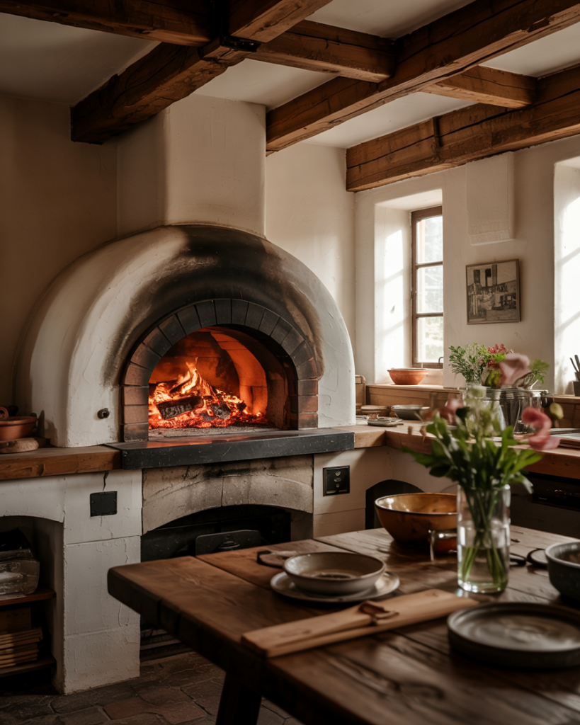 An accent faux brick oven wall is a great way to add old-world charm to contemporary settings. Whether red, whitewashed, or dark charcoal, bricks go well with farmhouse-style interiors. The combination also works with outdoor-inspired materials like stone or reclaimed wood and visually anchors the space. Even a new build instantly feels like a “heritage kitchen.”