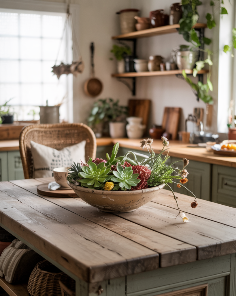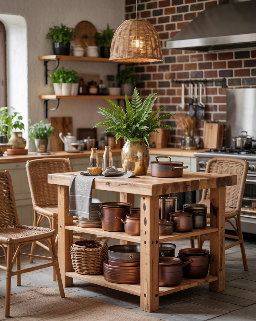 Boho elements bring free-spirited comfort to rustic kitchens. Combine patterned rugs, rattan bar stools, and lush greenery for a green, relaxed vibe. Earthy ceramics and mismatched chairs make the space feel simple and human. Influencers like Justina Blakeney advocate this soulful mix that thrives on personality.