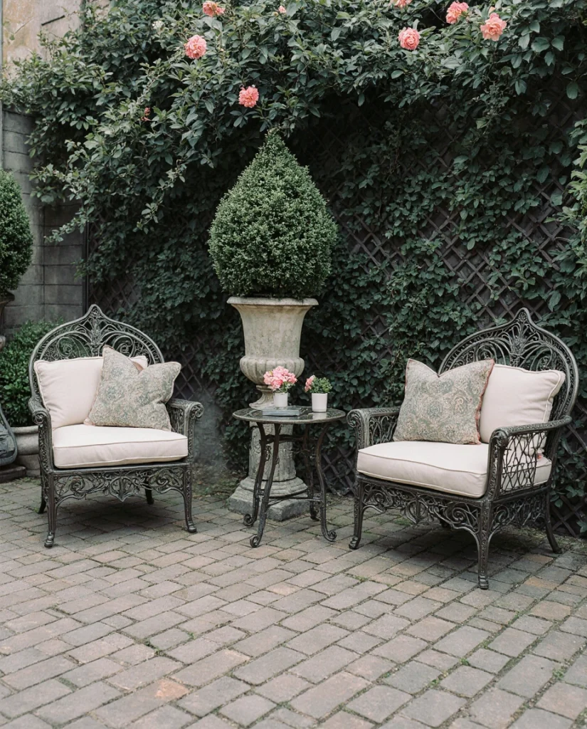 Position a weathered wooden or cast iron bench directly beneath a flowering tree like dogwood, cherry, or magnolia for one of the most romantic spots in any secret garden. When the blooms appear in spring, you’ll sit under a canopy of petals that eventually drift down like snow, creating those Pinterest-worthy moments everyone dreams about. The dappled shade makes this the perfect reading spot in summer, while in fall the changing leaves provide a completely different but equally beautiful experience. Choose a bench with ornate details or distressed paint that looks like it’s been there forever.