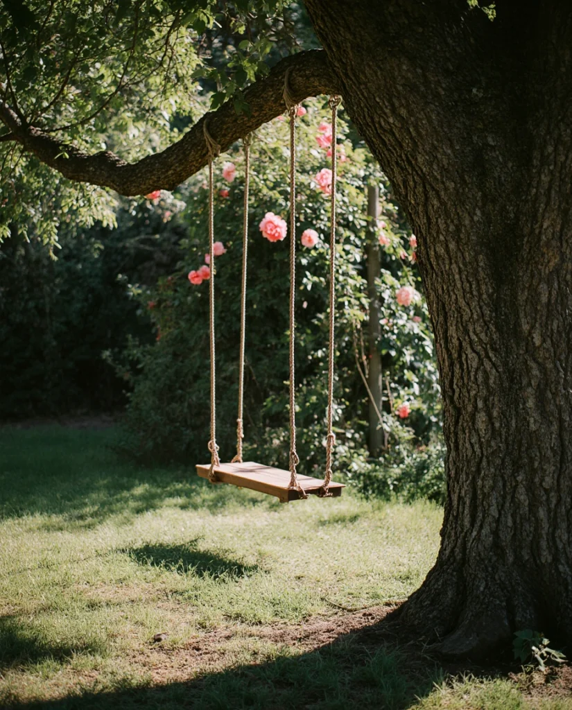 Add a vintage-style tree swing or swinging garden bench in a place where blossoming climbing plants will drape over it and envelop it in greenery. For a swing to be completely and safely functional simply choose a nice tree at least 8-10ft in height, with a wide, horizontal limb at least 8-10ft in height. Every season the garden will be more integrated with the swing, and with some plants it will be completely hidden in the foliage. For safe swinging, put it in a small open area with soft ground covers like thyme or clover instead of bare dirt, further enhancing the garden.