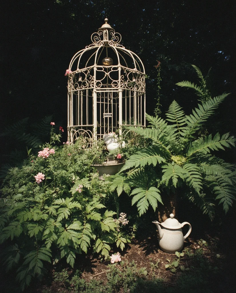 Bring the intricate, whimsical world of a coloring book to three-dimensional life by deliberately planting the kinds of detailed, layered scenes that appear in illustrated garden pages. Think of it as painting with plants—combine different leaf shapes, textures, and shades of green to create living compositions that would translate beautifully to pen and ink. Include architectural elements like vintage birdcages, weathered urns, decorative garden stakes, and winding paths that add structure to the abundant plantings. Every view should offer the kind of intricate detail that rewards close observation.