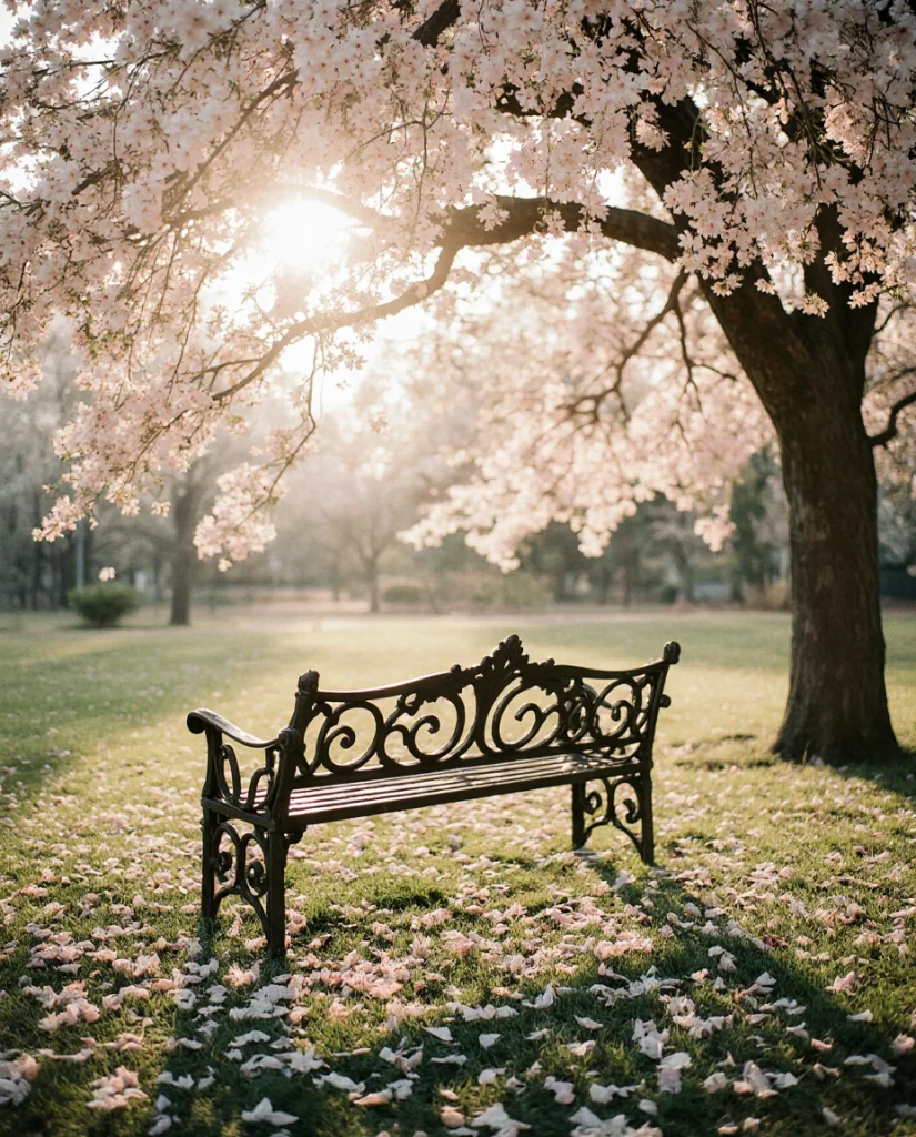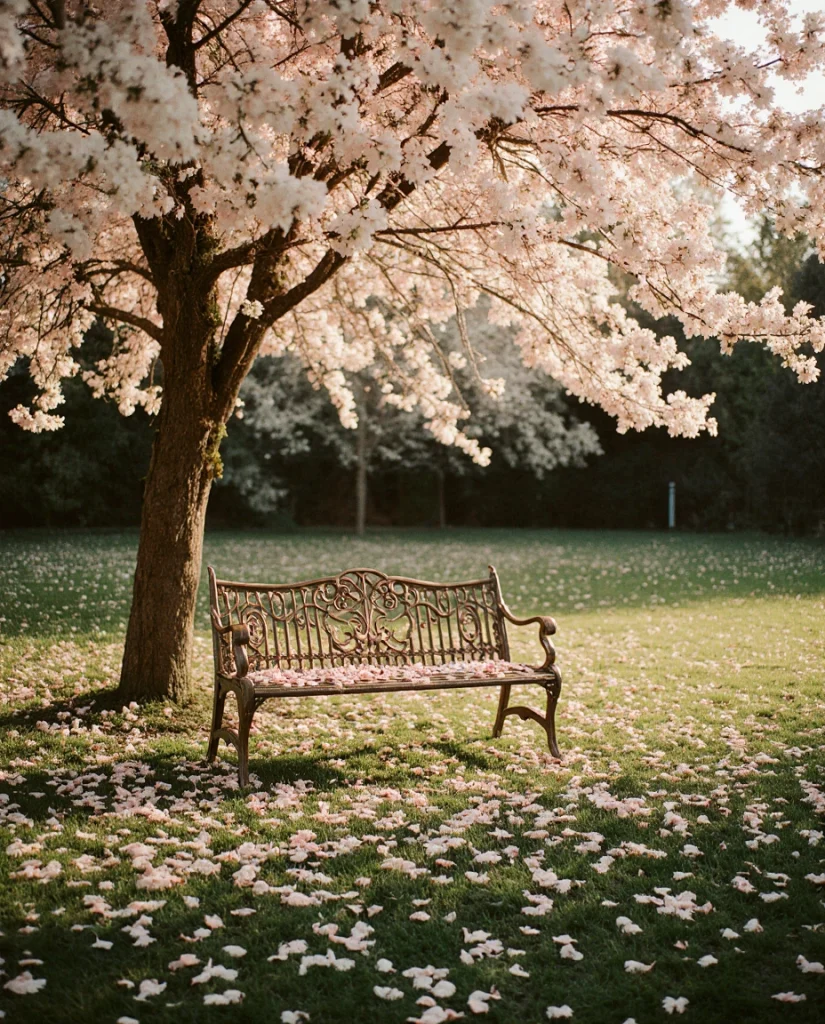 8. Vintage Bench Beneath a Flowering Tree