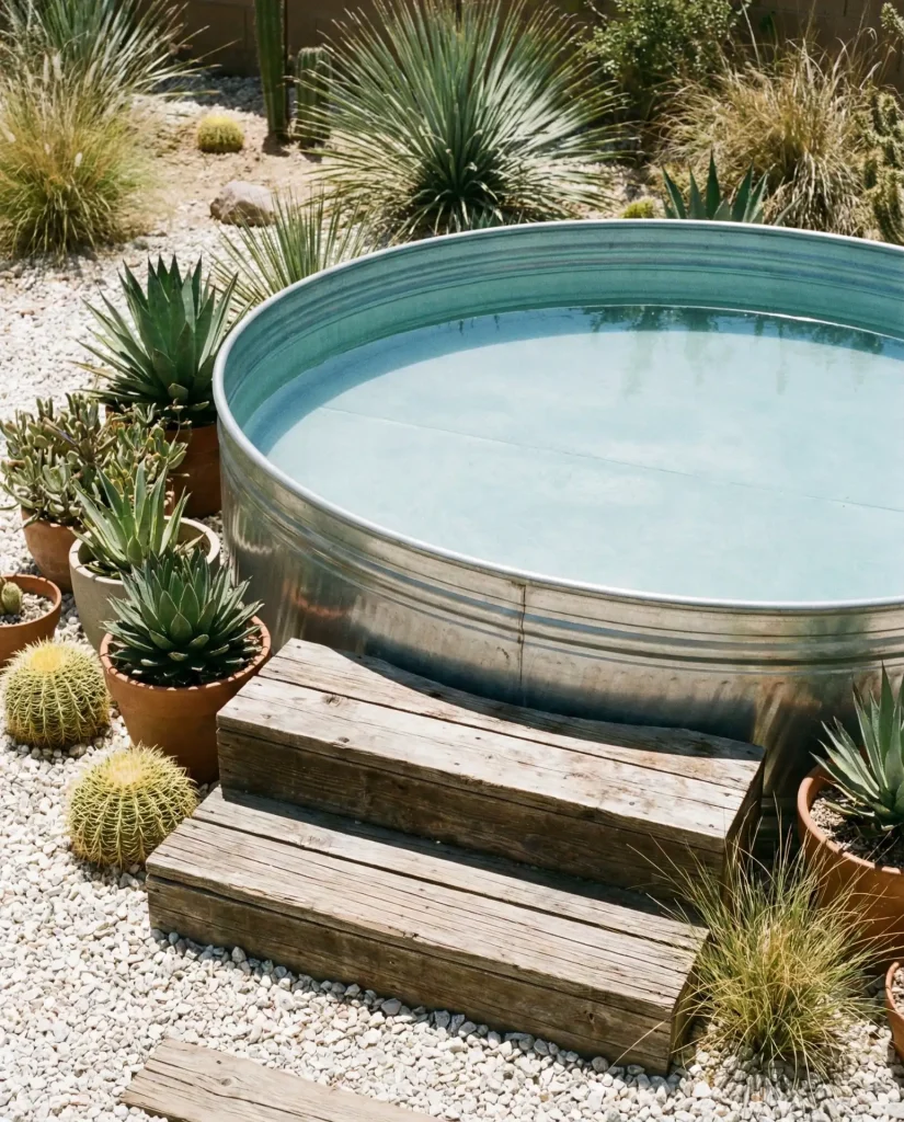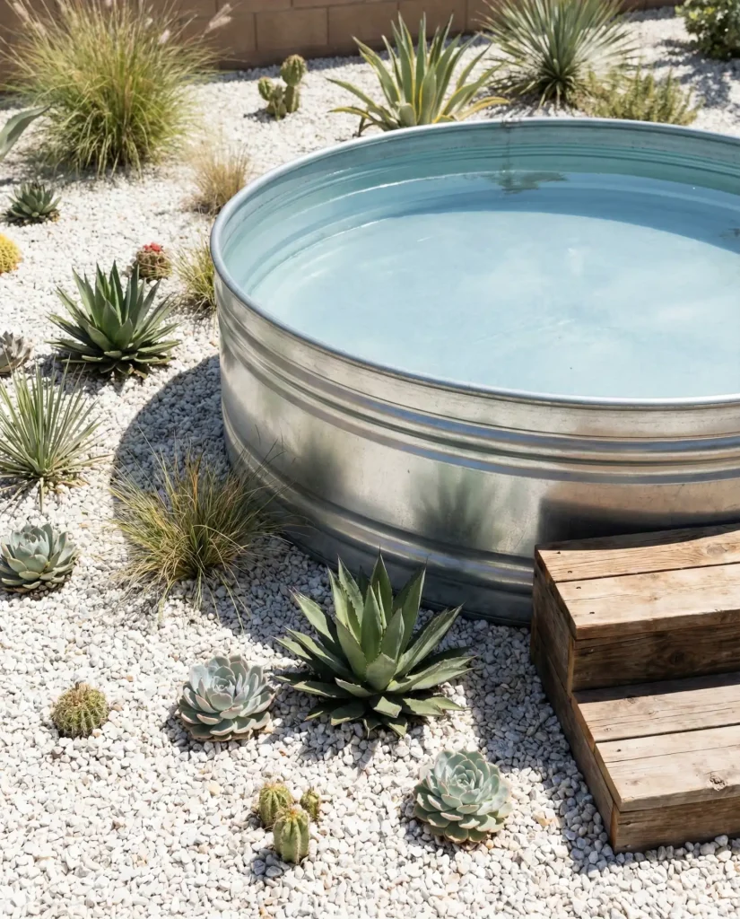 Galvanized stock tanks repurposed as pools deliver cheap charm and a farmhouse aesthetic. These cylindrical tanks, originally designed for livestock, hold 700 to 1,000 gallons and cost a fraction of traditional pools. Surrounding the tank with crushed gravel and native plantings creates a low-maintenance oasis that feels organic and unforced. A simple filtration pump and sand filter keep the water clean, making this one of the most budget-friendly pool solutions available.