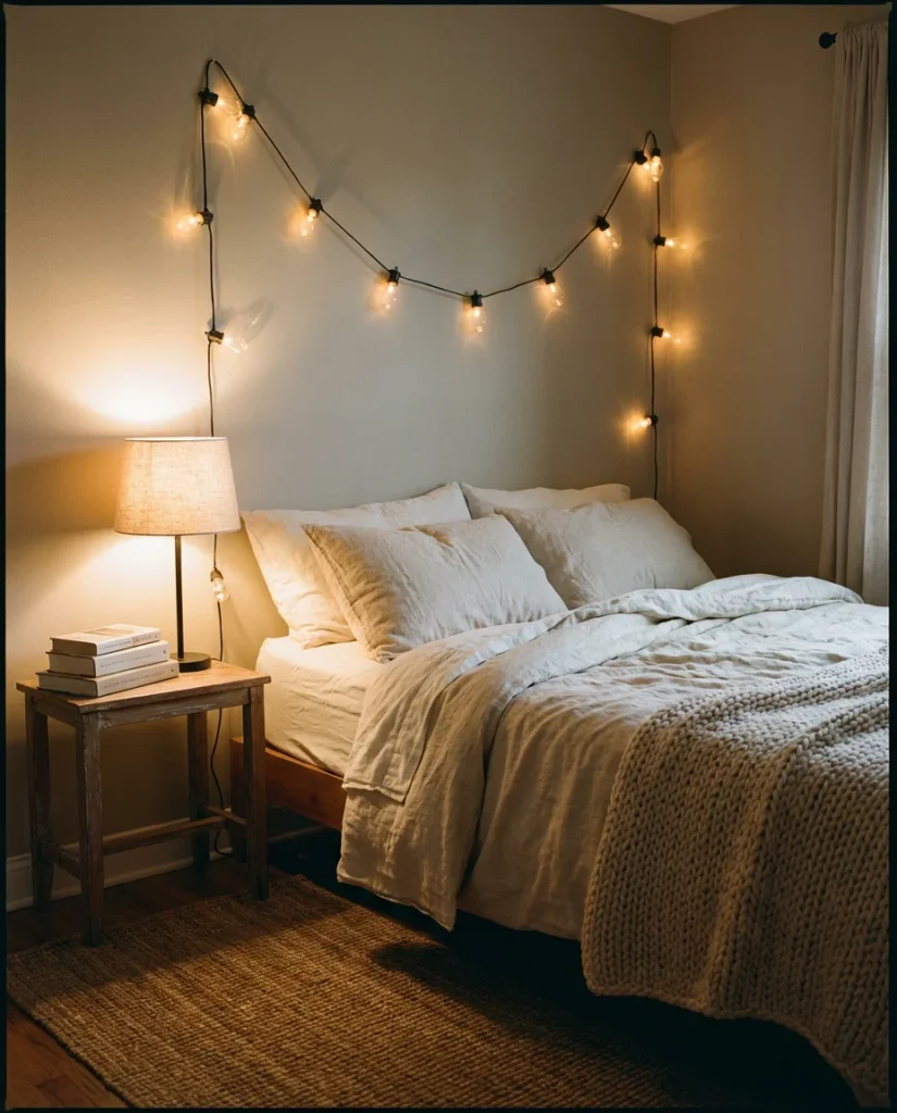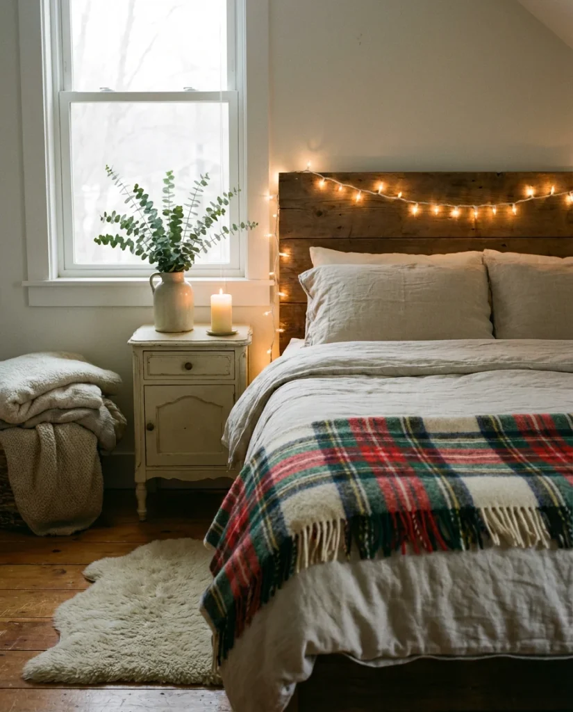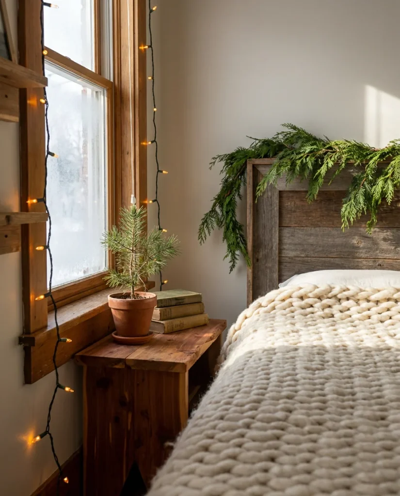 The warmth people chase in Christmas bedroom decor—string lights, soft knit textures, pine greenery, candlelight—is actually just excellent cozy layering that works in any season. In small bedrooms especially, the holiday instinct to add warmth and texture through lighting and soft goods is the right instinct. String lights draped over a simple wooden headboard or framed mirror create year-round ambient lighting that’s every bit as magical in March as it is in December. The key is choosing warm white or amber bulbs, not multicolor.