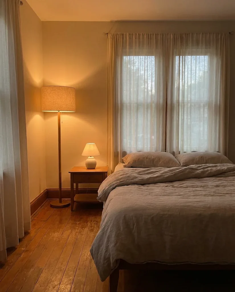 Overhead lighting is the enemy of a beautiful small bedroom. It’s flat, unflattering, and wipes out any sense of aesthetic mood the rest of the room tries to create. In 2026, the shift is toward layered lighting: a warm-toned bedside lamp, a low-wattage floor lamp in the corner, and maybe a string of Edison bulbs or LED strip lights along the headboard wall. For inspo seekers who spend time on Pinterest at night, this kind of lighting setup is what makes bedroom photos look so warm and inviting—and it’s genuinely achievable without an electrician.