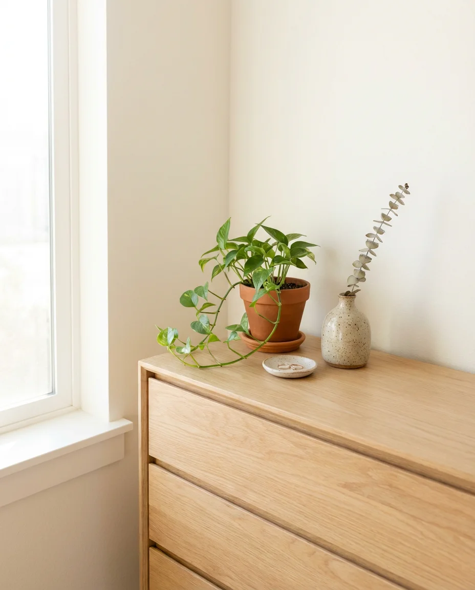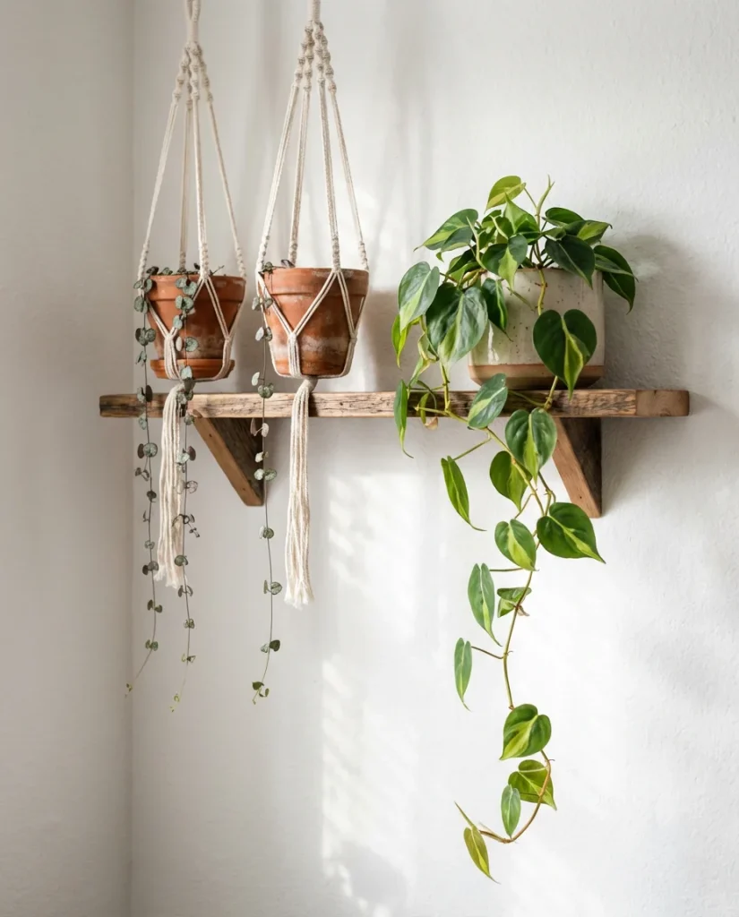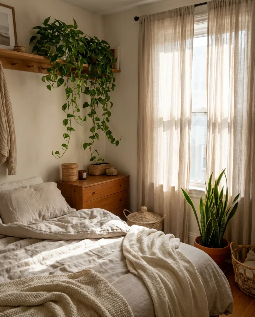 For low-light small bedrooms (which is most of them), the best options are pothos, ZZ plants, snake plants, and heartleaf philodendrons—all of which tolerate indirect light and irregular watering reasonably well. A wall-mounted plant shelf keeps greenery off precious floor space, and hanging planters near the window are one of the most effective ways to use vertical space that would otherwise go unused. If you’re new to plants, starting with a pothos or a snake plant is the lowest-risk entry point: both are nearly impossible to kill.