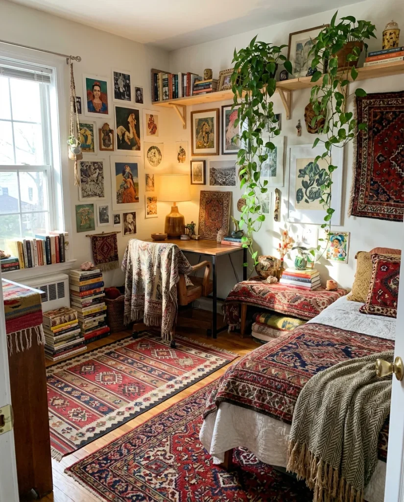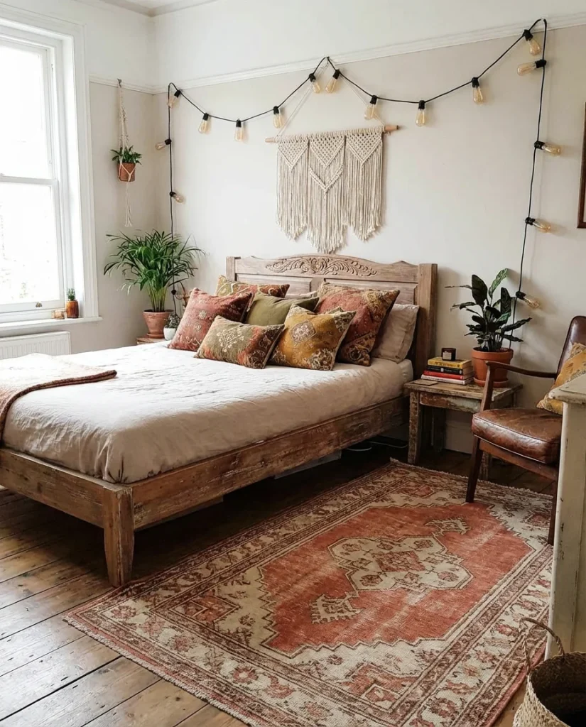 The bohemian small bedroom aesthetic is having a real moment in 2026 — and it’s especially forgiving of tight square footage. The whole point of boho layering is that it looks intentionally collected, not perfectly coordinated. A Moroccan-style rug, a macramé wall hanging, a mix of printed throw pillows, and warm Edison bulb lighting can turn the most basic rental bedroom into something that feels genuinely personal. This is also a great style for 2 sisters sharing a room, since each person’s individual pieces can coexist under the same aesthetic umbrella.