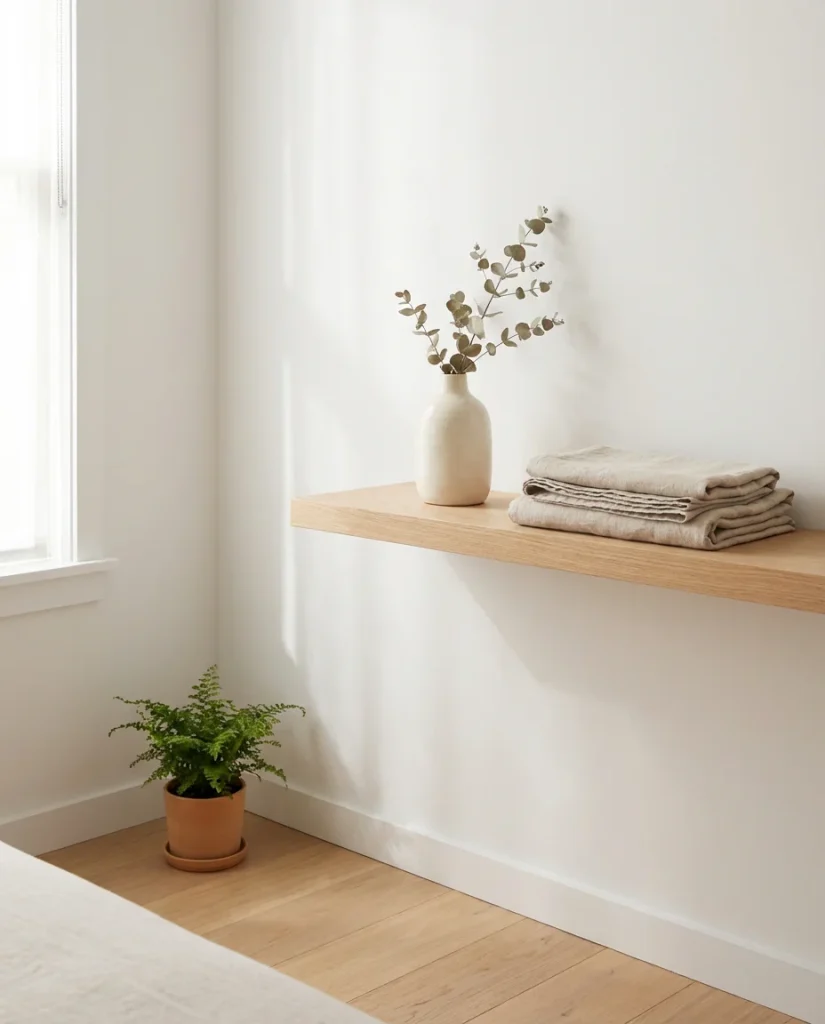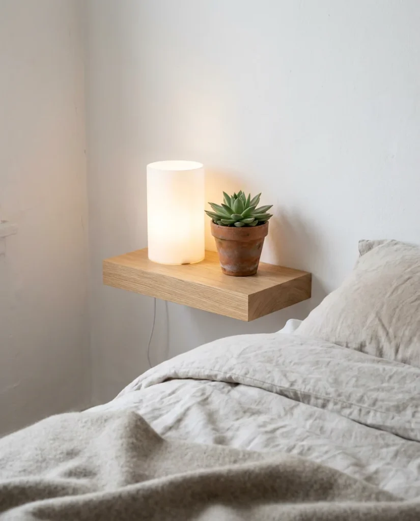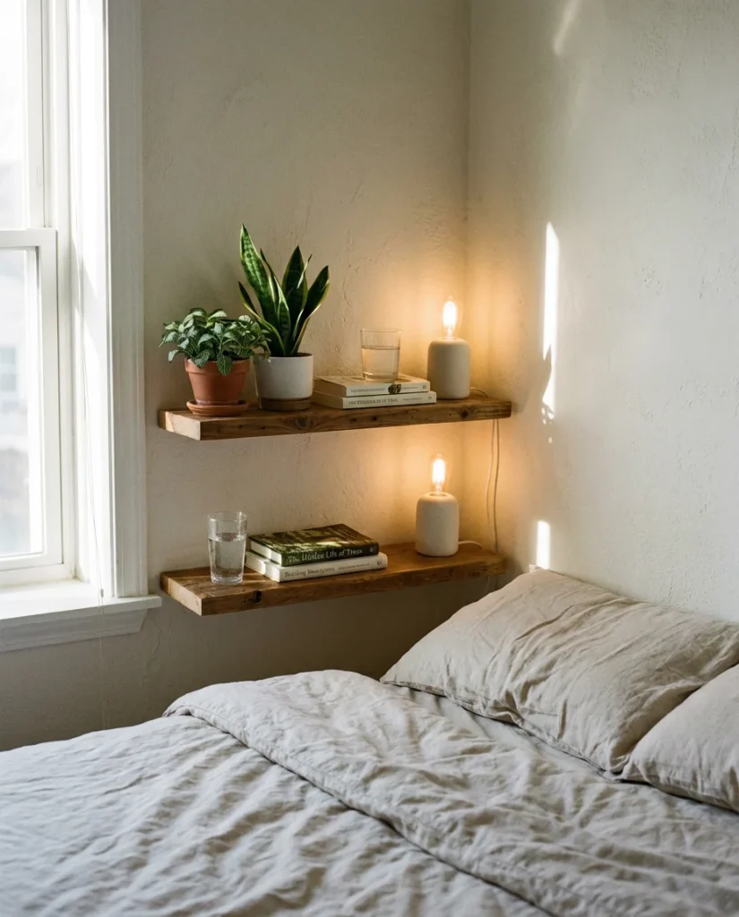 When floor space is precious, the last thing a small bedroom needs is a bulky nightstand eating up real estate beside the bed. Floating shelves are one of the smartest ideas on a budget you can pull off in under an afternoon. A single shelf installed at mattress height gives you a spot for your phone, water glass, and a small plant—without the visual weight of furniture legs. This works especially well for couples sharing a tight room, since two small shelves take up a fraction of the space two full nightstands would.