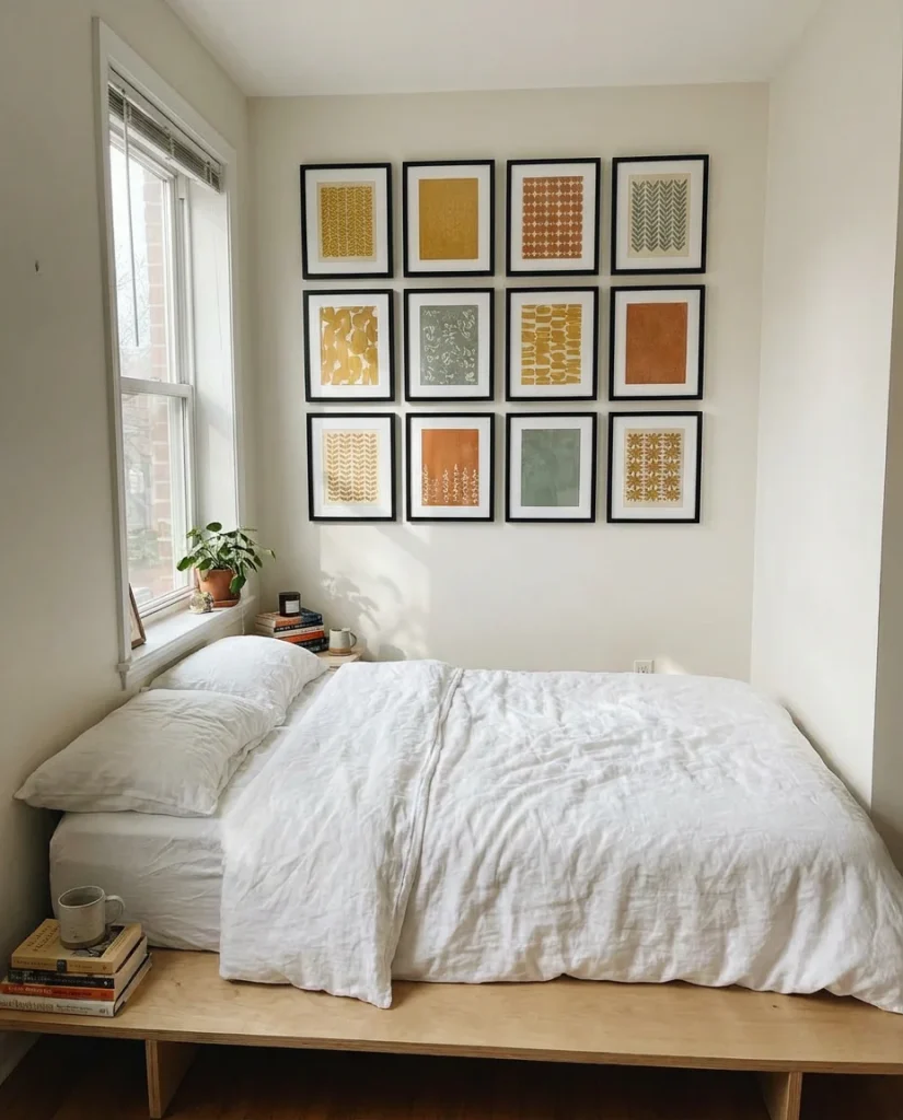 A colorful gallery wall in a small bedroom works when there’s a clear organizing principle holding the whole thing together. That might be a consistent frame color, a limited palette across all the prints, or a specific shape arrangement on the wall. Without that logic, a colorful gallery wall in a tight space just reads as chaotic. But when it’s done right, it brings personality, joy, and energy into a small room in a way that painted walls or simple art prints alone can’t. For aesthetic-idea seekers, this is one of the most personalized looks you can create.