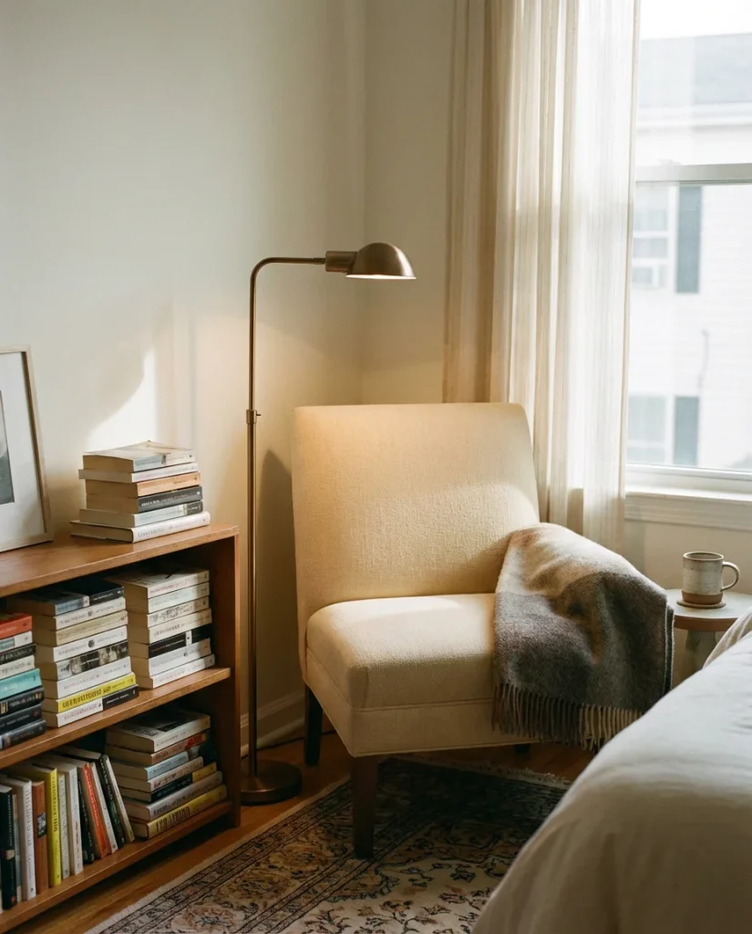 If your small bedroom has even one corner that isn’t being used to capacity, there’s a reading nook waiting to happen. A small upholstered chair or floor cushion, a narrow floor lamp, and a low bookshelf can claim that dead corner and turn it into the coziest spot in the apartment. This is a setup that speaks directly to the introverted American’s Pinterest board—the idea that your bedroom can hold not just sleep but also solitude, reading, and genuine rest. Even in rooms under 200 square feet, a corner nook doesn’t have to feel cramped if it’s thoughtfully arranged.