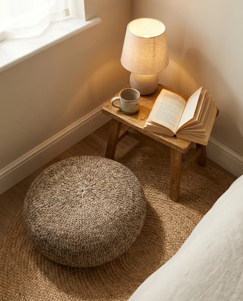 The best nook furniture for small bedrooms: a slipper chair (narrow profile, no arms), a floor-level cushion on a low platform, or even a simple pouf paired with a wall-mounted reading light. IKEA’s POÄNG chair has been a go-to for decades because it’s slim, comfortable, and inexpensive. Add a small side table or a wall-mounted ledge shelf for your coffee cup and current book. This setup typically costs under $150 to pull together from scratch, making it one of the best value-per-square-foot upgrades you can make.