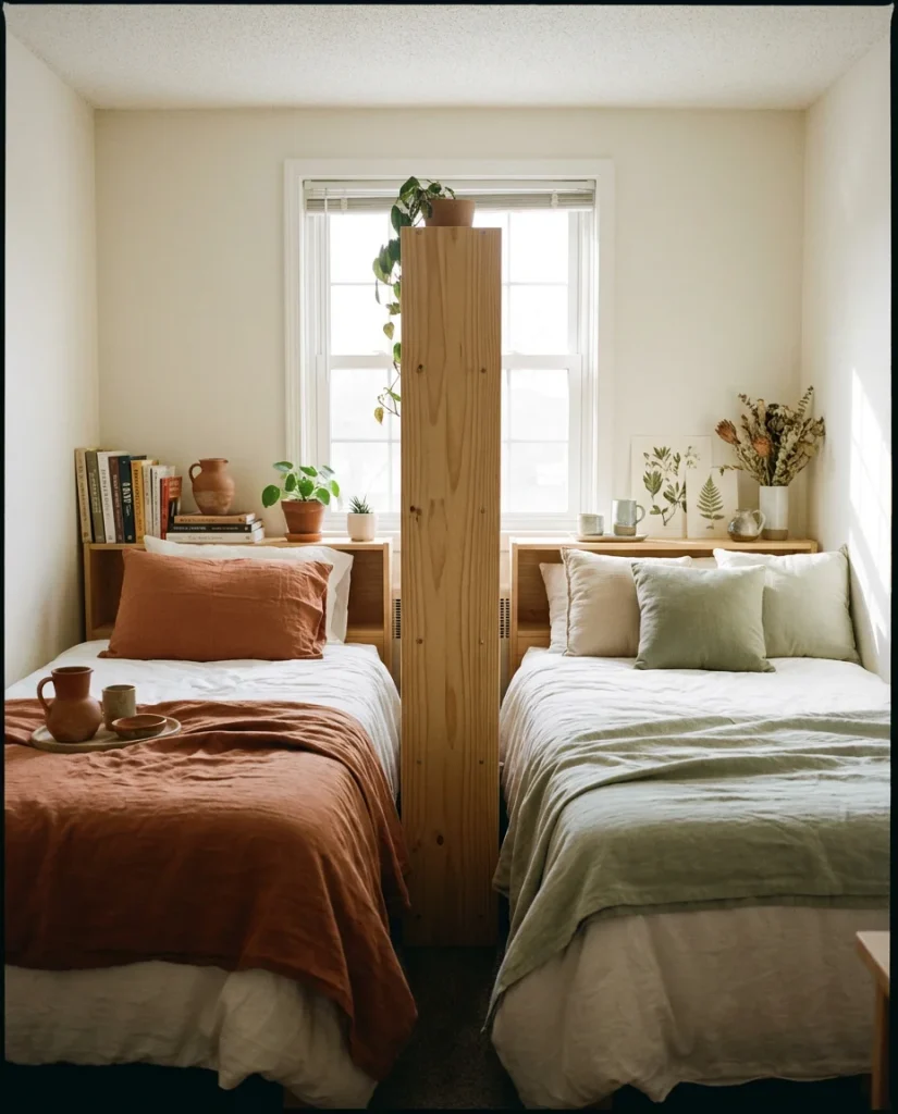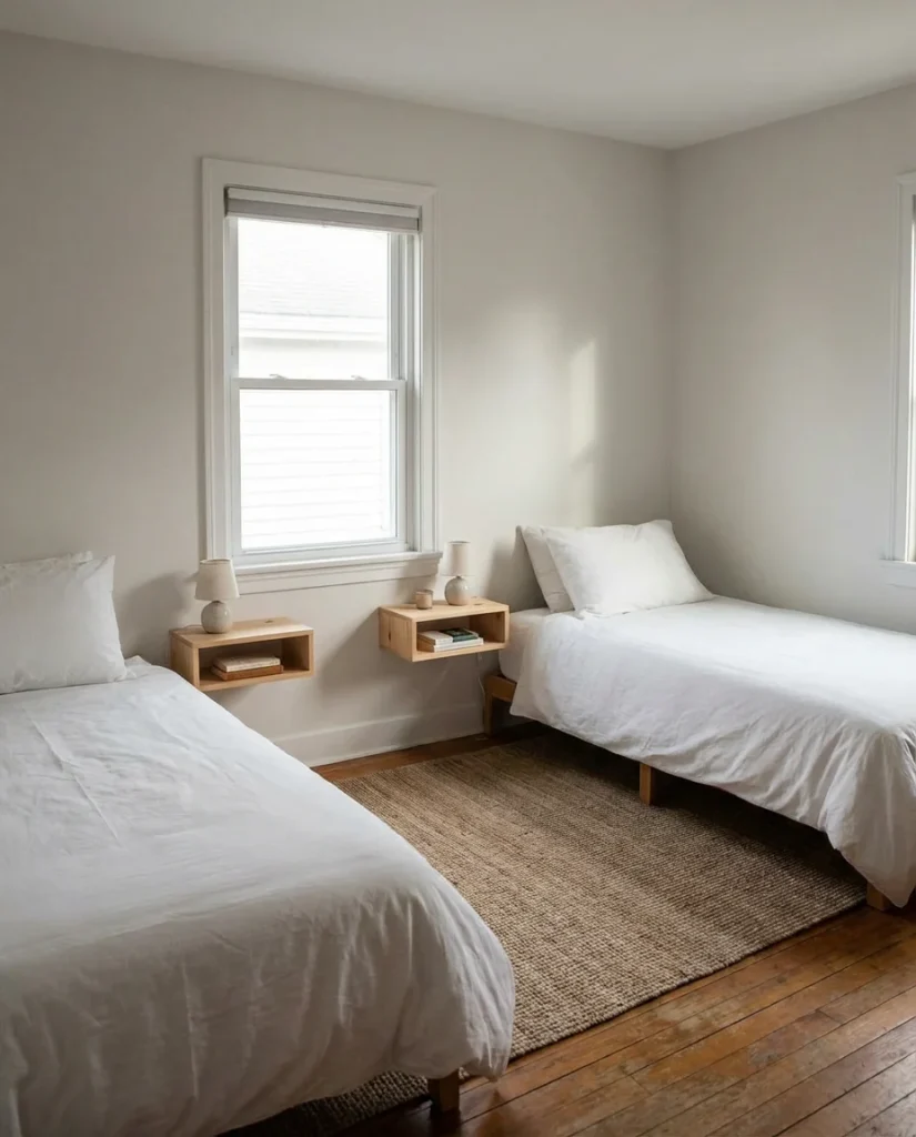 Expert-style tip: in a shared small bedroom, symmetry matters more than in solo spaces. Two matching nightstands, two reading lights, and each person having their own clearly defined closet or drawer zone prevent the visual (and literal) chaos that often plagues shared rooms. Even if you’re working with mismatched furniture, adding matching hardware or identical lamps creates a sense of order that feels intentional. Organization at the structural level is what makes a small shared room feel calm rather than cramped.