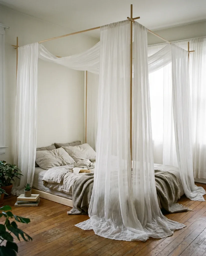 A real homeowner in a 280-square-foot studio apartment shared that adding a DIY sheer canopy to her bed was the single change that made the space feel like a real bedroom rather than a studio corner. She spent under $60 using tension rods and IKEA’s LILL curtains. If you want something more structural, thin wooden dowels or copper pipe corners mounted to the ceiling can create a more permanent frame. The whole project typically takes two to three hours and dramatically shifts the room’s atmosphere.