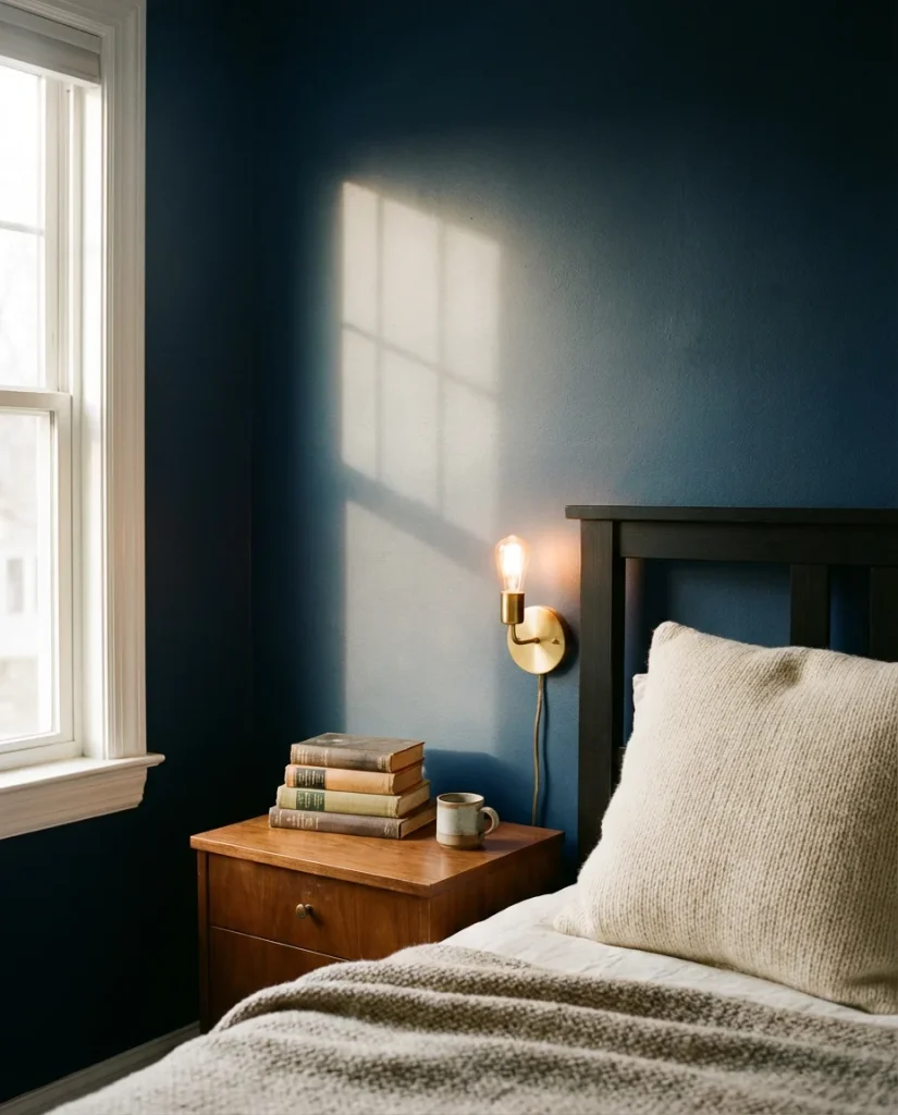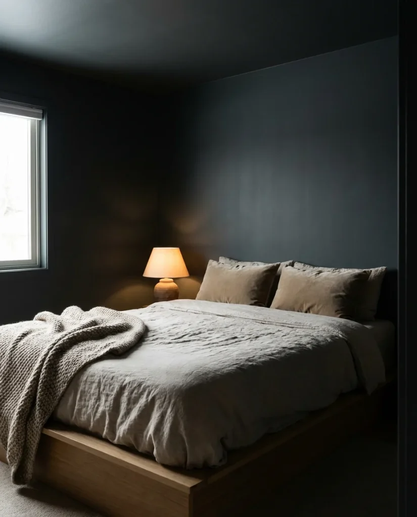 Dark walls work best in rooms that already get some natural light during the day—a south- or east-facing window will keep the space from feeling oppressive at noon. Layer in warm-toned lighting through bedside sconces or a low-wattage lamp, and use tactile textiles like chunky knit throws and velvet pillowcases to reinforce that cave-like comfort. One common mistake people make is choosing a dark color and then filling the room with equally dark furniture, which muddies everything. Keep larger pieces in lighter wood tones or soft cream to let the walls do their thing.