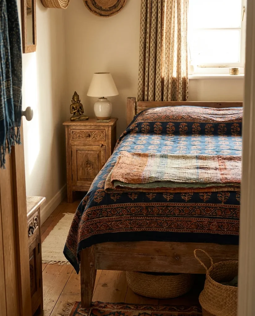 Where it works best: in apartments and starter homes where the walls are neutral and the furniture is basic. Indian textiles do the heavy lifting aesthetically, and because many are available for under $50 on platforms like Fab India, Etsy, or even Wayfair, they’re accessible at almost every budget point. Layering a kantha quilt at the foot of the bed with a block-print cushion and a small brass or terracotta decorative piece on the nightstand creates an immediately cohesive, globally inspired look without spending much at all.