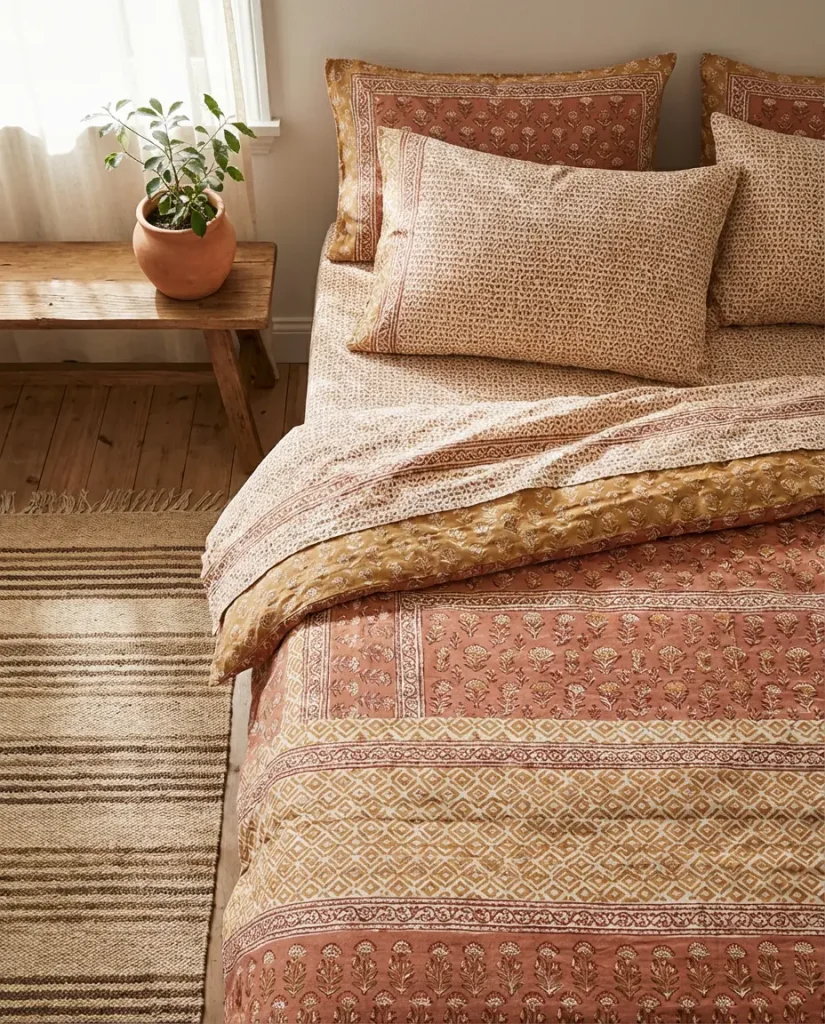 Block-printed cotton bedspreads, embroidered kantha quilts, and hand-woven dhurrie rugs have been a quiet staple of well-traveled American homes for decades—and in 2026, they’re fully mainstream. For anyone searching for Indian ideas for indian bedroom decor, these textiles offer something mass-produced bedding simply can’t: genuine character. A single hand-block-printed bedspread from Jaipur can transform a plain white bedroom into something that looks like it was designed with intention, not assembled from a single catalog.