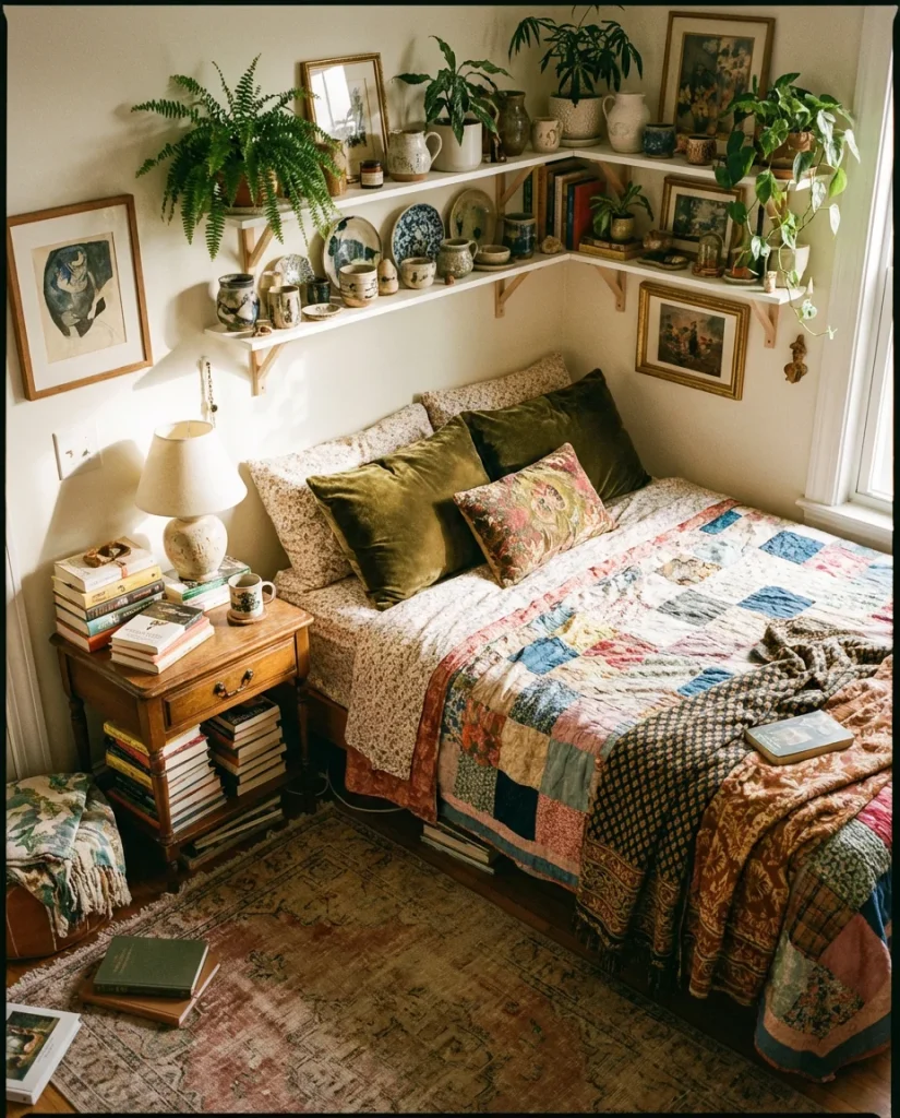 The structural rule for maximalism in small bedrooms: keep the floor as clear as possible. All the visual complexity should happen vertically—on walls, shelves, and surfaces—rather than on the floor. When the floor is clear, even a very visually busy room doesn’t feel cramped because there’s physical room to move. Use risers, wall-mounted shelves, and tall bookcases to push the density upward. A maximalist room with a clear floor reads as curated; the same room with piles on the floor just reads as messy.