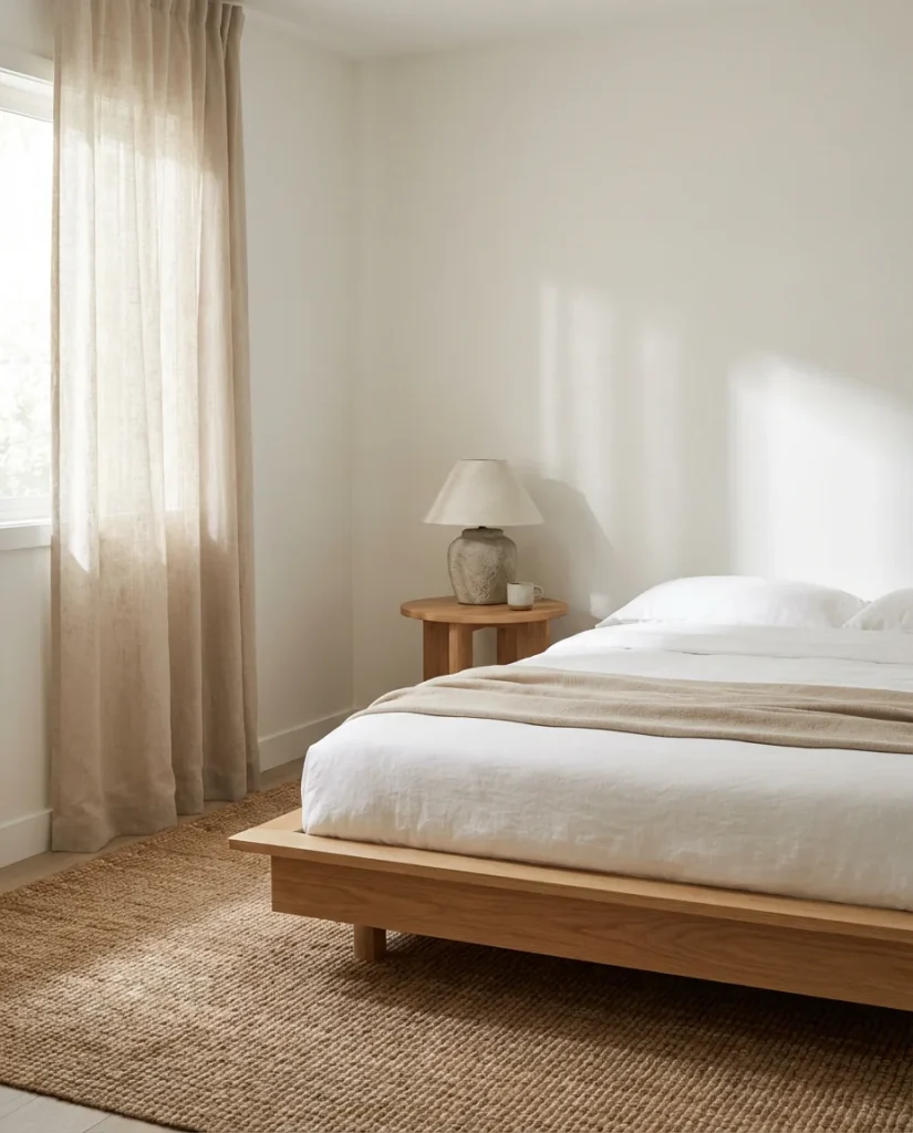15. Minimalist Neutral Bedroom With Natural Wood and Stone Textures
