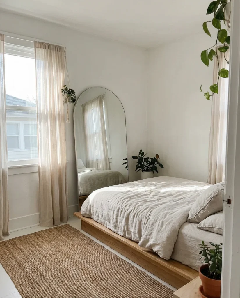 The mirror trick is old—but it works, and the way it’s being executed in 2026 small bedroom design is genuinely beautiful. A large floor-leaning mirror, a full-length mirror on the back of the closet door, or a decorative arched mirror on the wall opposite a window all serve the same functional purpose: they reflect light and create the visual illusion of depth. For cozy dark-palette rooms especially, a well-placed mirror can prevent the space from feeling too enclosed while preserving the moody atmosphere. This is one area where spending a little more on a beautiful mirror pays off visually.