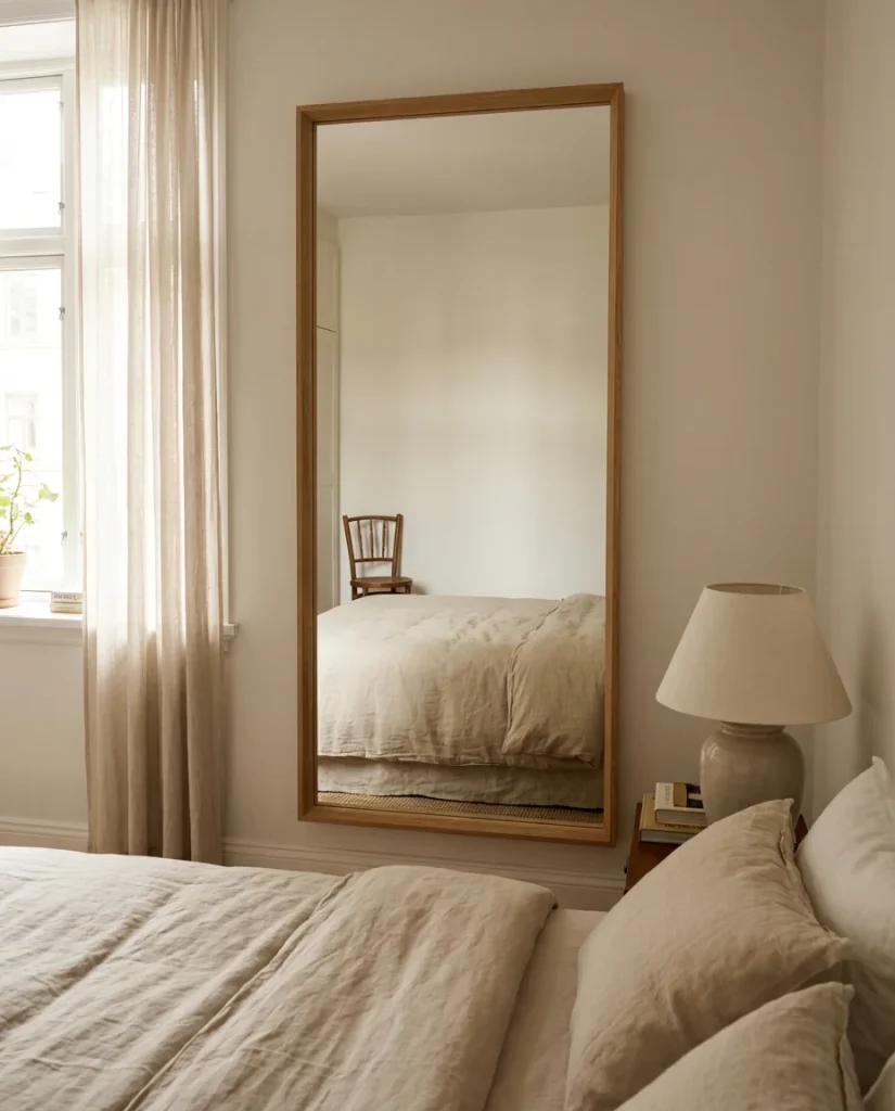 The best placement for a bedroom mirror in a small room is directly across from a window, so it reflects the outdoor light back into the space. The second-best placement: at the end of the room, creating a perceived extension of the space. One thing to avoid is placing a mirror directly facing the bed, which some people find uncomfortable for sleep and which Feng Shui practitioners consistently flag as a problem placement. An angled position, or mounting on a side wall, captures light without the direct reflection issue.