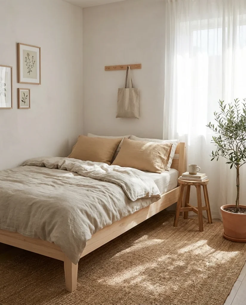 In the world of small bedroom inspo, the Japandi-influenced neutral bedroom keeps climbing every mood board for good reason. The combination of natural wood, off-white walls, stone or ceramic accents, and absolutely no visual clutter is both incredibly calming and incredibly photographable. For people who feel overwhelmed by their current bedroom, stripping back to this kind of quiet palette often feels like a reset. It works especially well in small rooms because there’s nothing competing for visual attention—the clean lines and natural materials do all the work.