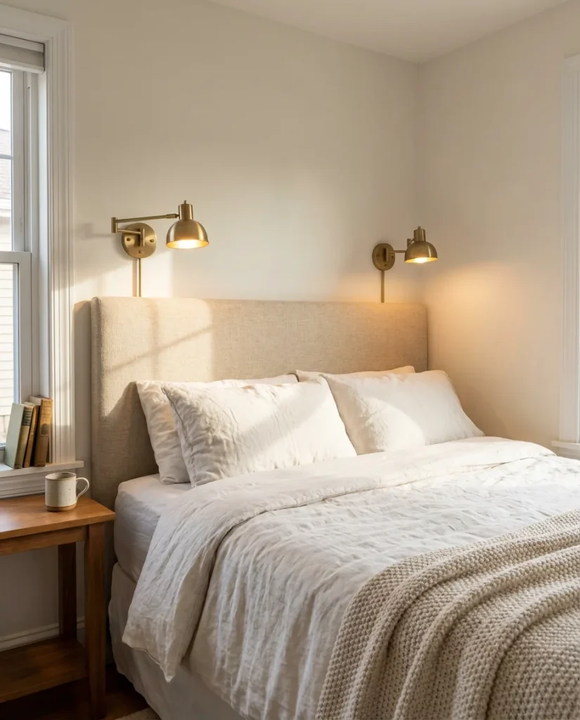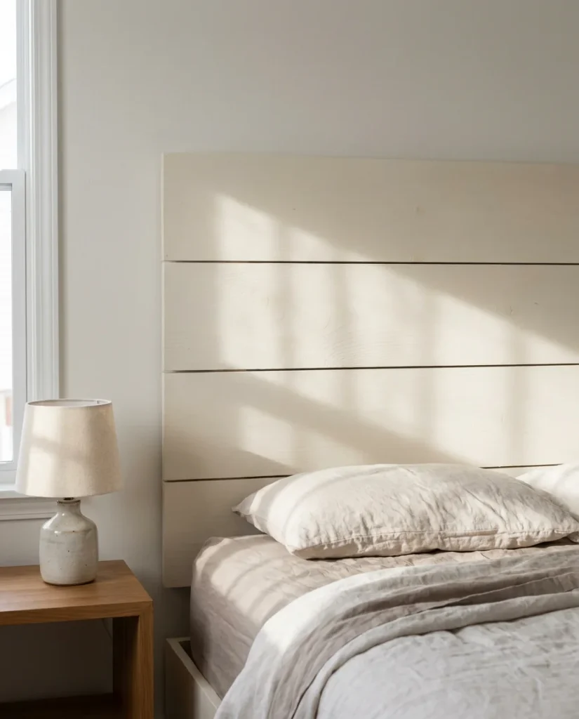For a non-fabric option, a row of shiplap or wood planks painted the same color as the wall creates a subtle architectural headboard effect that photographs beautifully and doesn’t require any upholstery skills. Even something as simple as a large piece of rattan or a vintage door mounted horizontally behind the bed can work as a headboard in the right space. The key is scale—the headboard should be at least as wide as the mattress and ideally extend 24–36 inches above it for proper visual proportion in a small room.