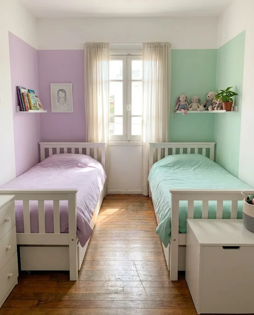 Color coordination is the easiest way to make a shared small bedroom feel cohesive without making each person sacrifice their individual taste. Choose a shared neutral base—white walls, natural wood floors—and let each person pick accent colors for their side. One sister might choose soft lavender and cream; the other might prefer mint and warm white. When the base is the same, these two palettes coexist surprisingly well. A curtain or bookshelf divider between the two beds adds both a sense of privacy and a design feature that elevates the whole room.