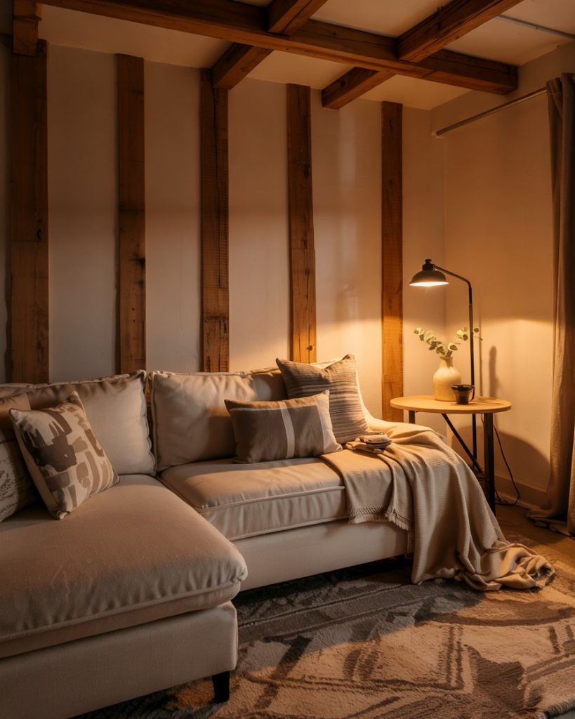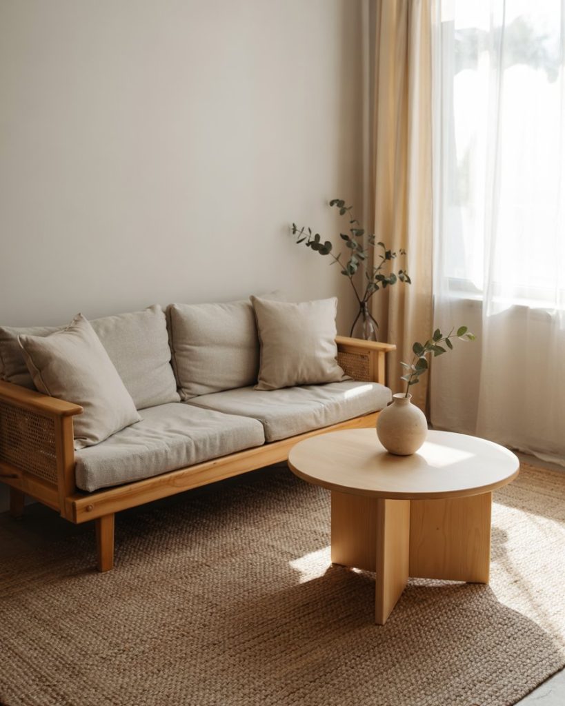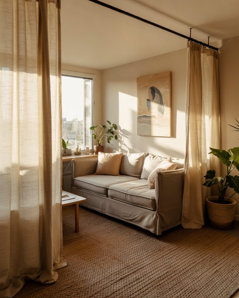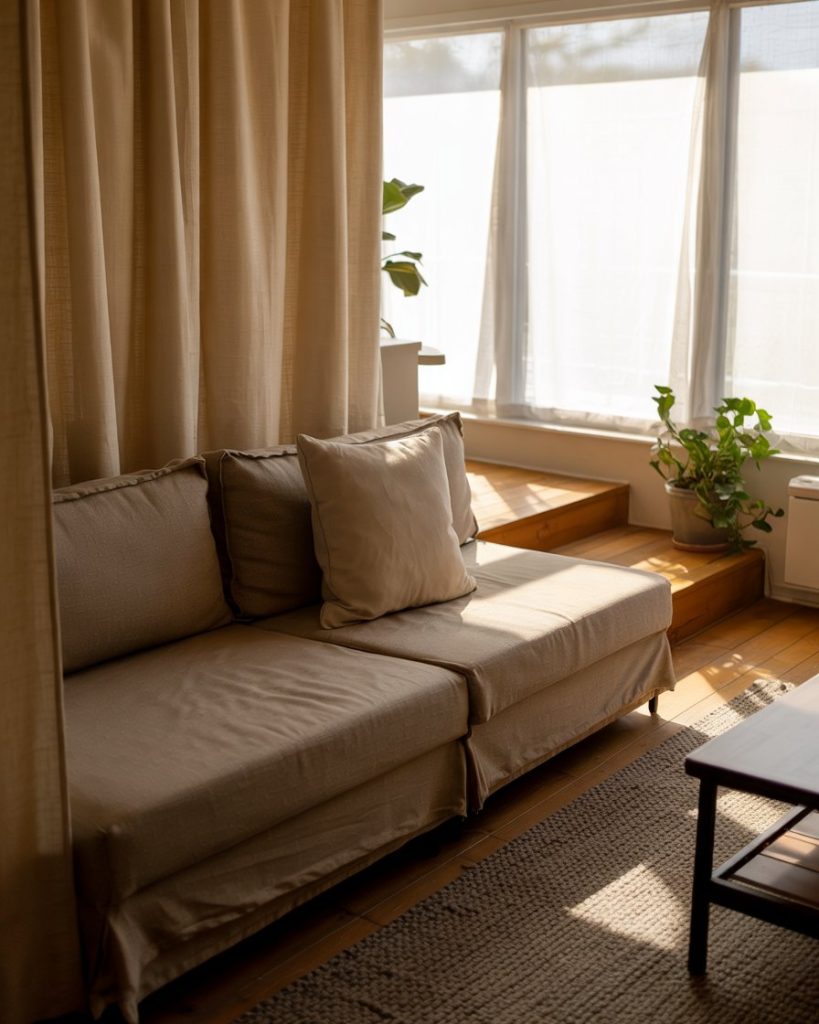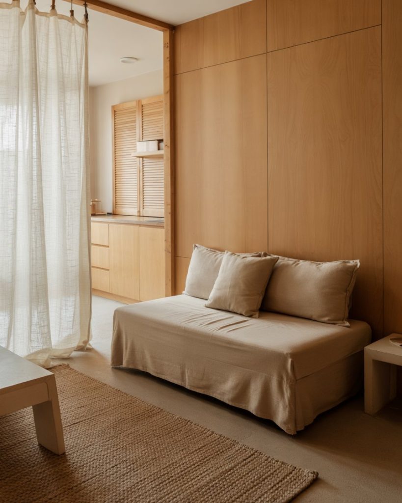 Blend Scandinavian simplicity with coastal warmth to create a tiny cozy haven. In a 500 sq ft studio, light wood tones, woven rugs, rope details, and white linens build a relaxed, aesthetic environment. A slatted wood divider ensures privacy while keeping the layout airy and balanced. This hybrid trend of 2026 embodies calmness, perfect for both solitude and shared living.