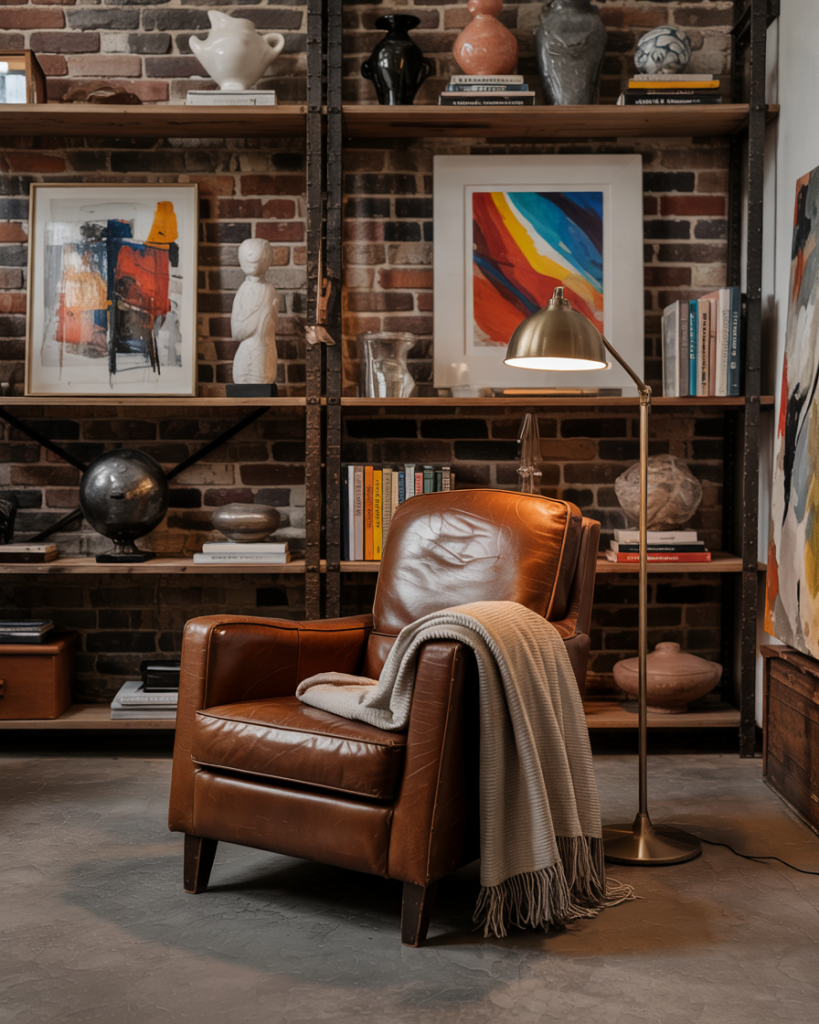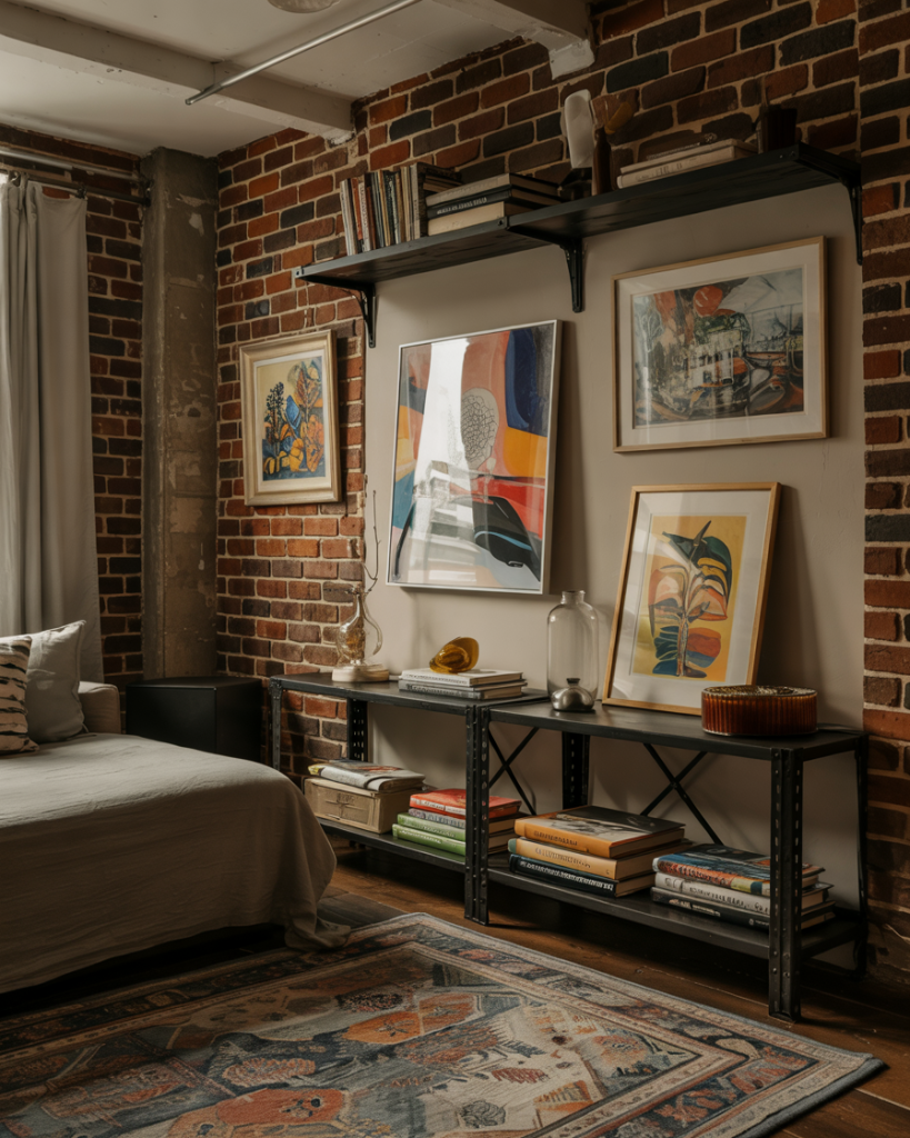 A creative twist on industrial design gives your micro studio around 400 sq ft a gallery-like appeal. Keep the layout rectangle simple with exposed brick and steel shelving, but add colorful art and soft textiles for warmth. This blend of grit and imagination offers a tiny aesthetic that’s both bold and personal.