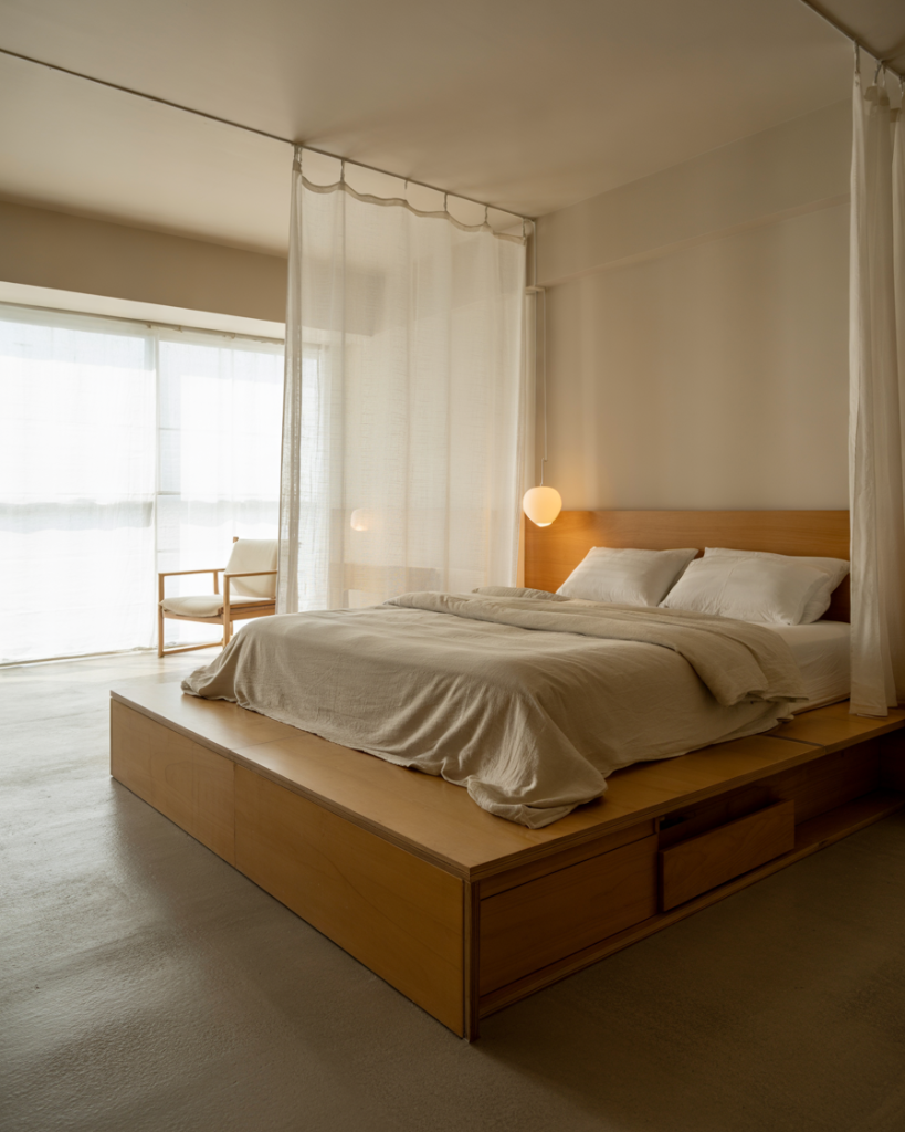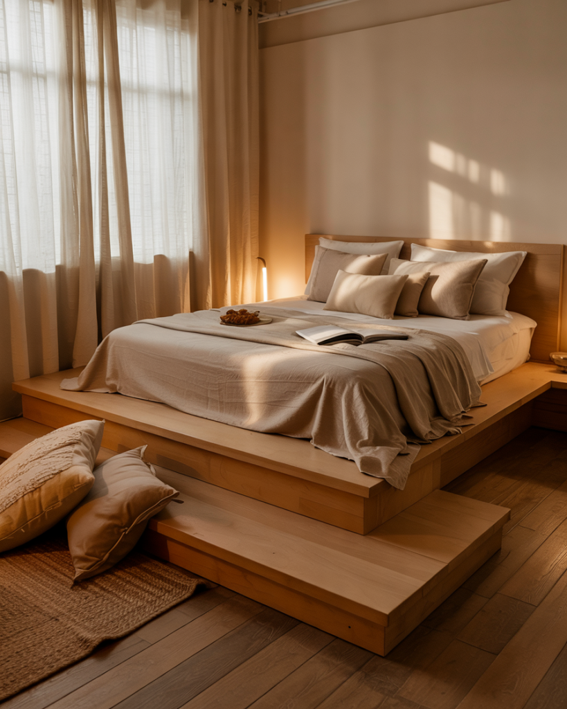 Maximize space by building an elevated sleeping platform in your tiny 500 sq ft home. This layout separates the bed zone while freeing up space below for a desk or storage. Add subtle lighting and curtains as a divider, maintaining a cozy, aesthetic vibe without clutter. It’s a smart trick used by top small-space designers worldwide.