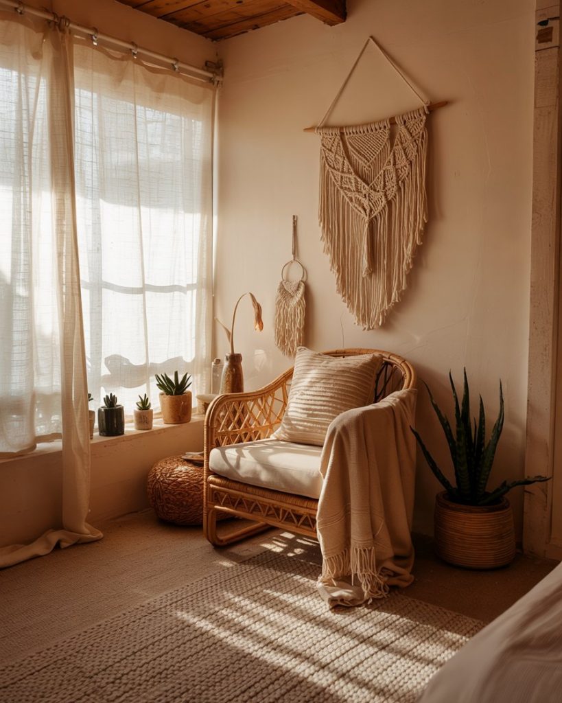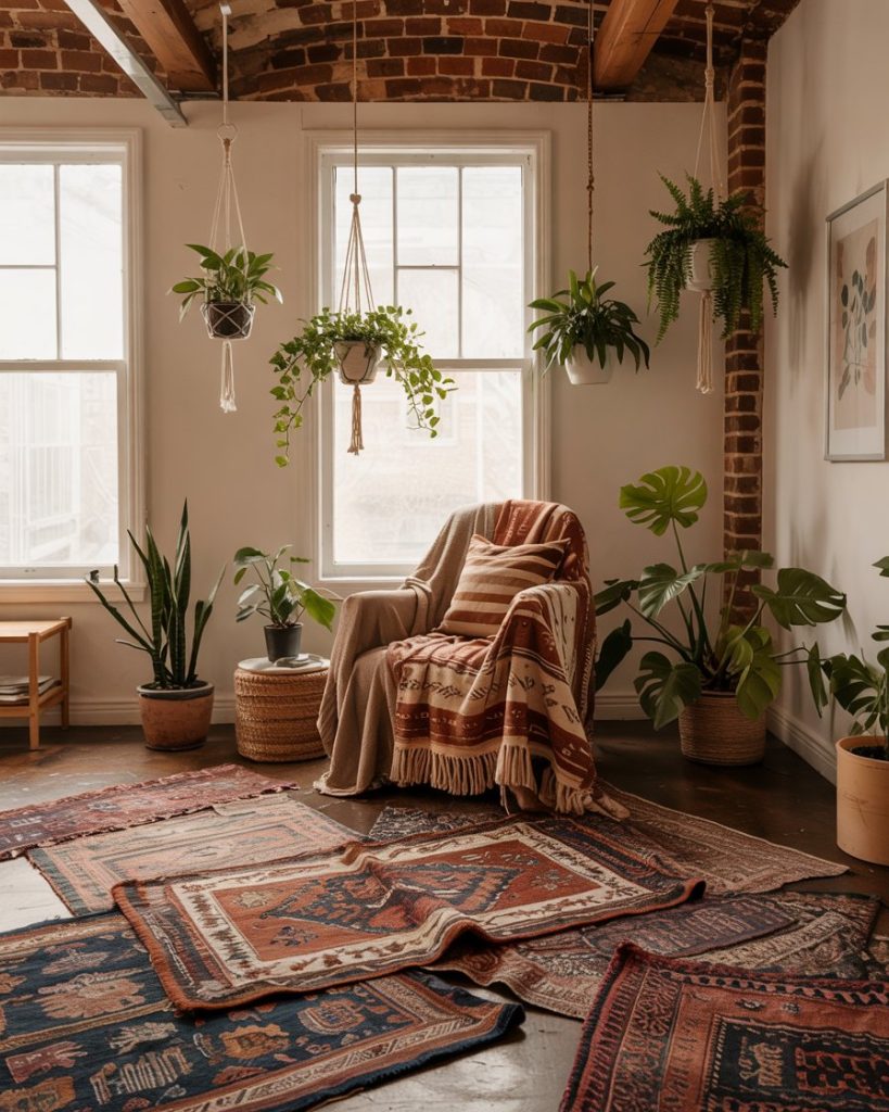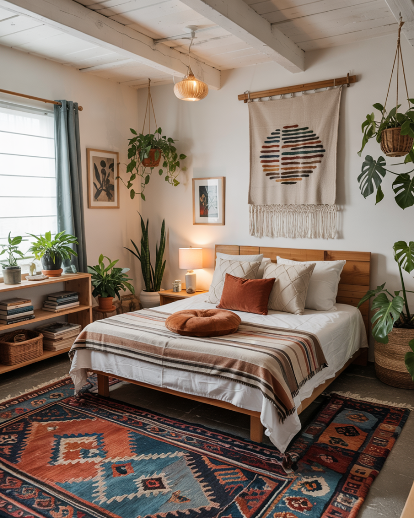Combine Bohemian freedom with rustic textures to craft a tiny cozy escape around 450 sq ft. Use rattan, macramé, and wood accents to warm the atmosphere, paired with natural fabrics and soft lights. This layout suits anyone seeking comfort and individuality—a lived-in, artistic space that feels deeply personal.