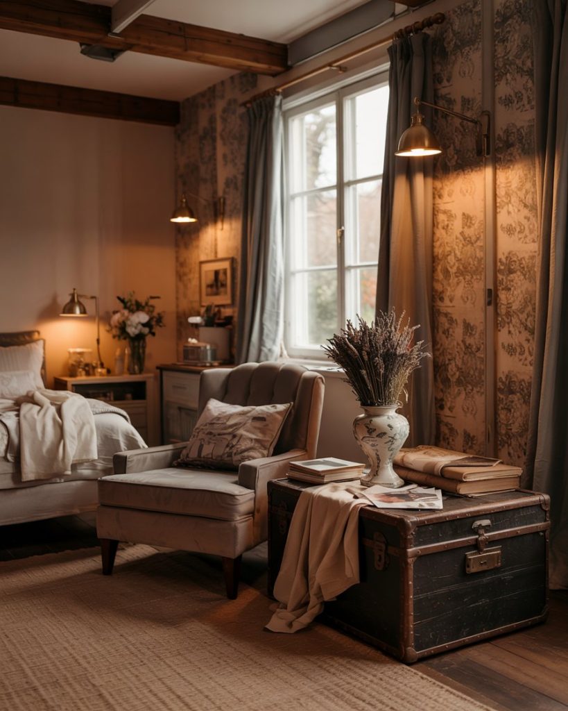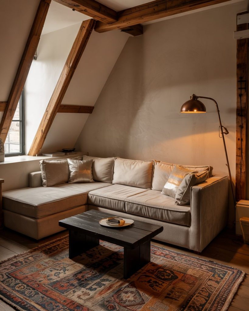 For those living in an attic or loft basement, celebrate nostalgia through vintage finds. At about 400 sq ft, your layout can feature antique trunks, floral patterns, and brass lamps that add soul. The tiny aesthetic pairs beautifully with exposed beams, creating a charming, time-worn character reminiscent of old Parisian apartments.