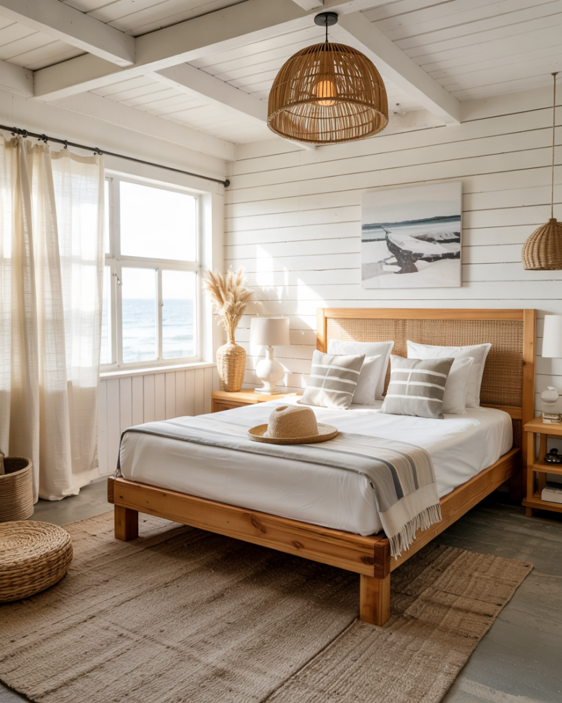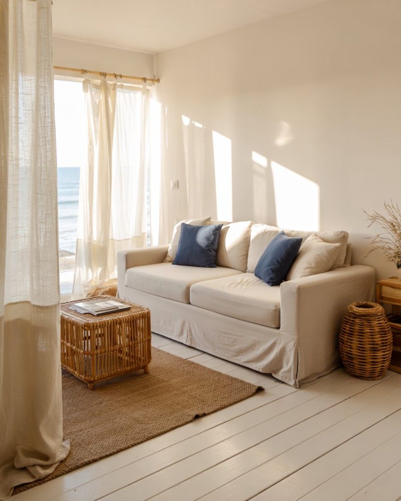 Designing a studio for 2 people can be both practical and romantic. A coastal theme with whitewashed walls, sandy neutrals, and touches of navy blue instantly opens up even a 450 sq ft room. A woven screen or bookshelf can act as a divider without interrupting the open layout. Add natural light, rattan textures, and seaside decor to create a breezy, cozy retreat that feels like a permanent vacation by the shore.