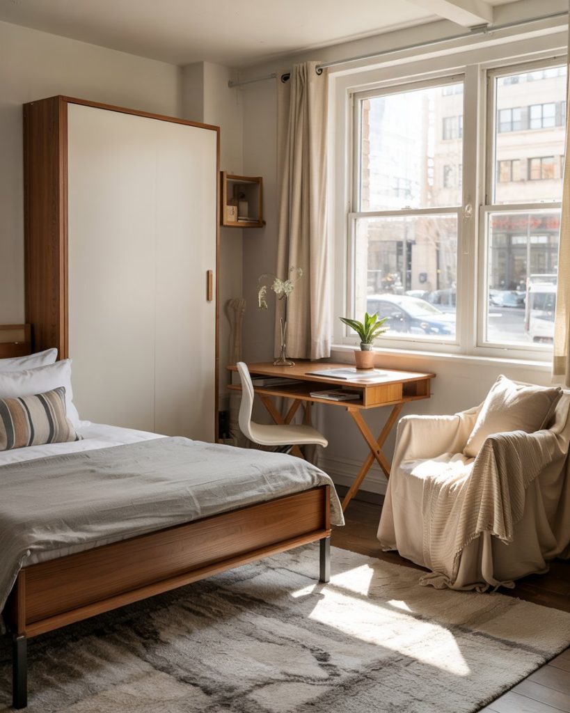 In an ultra-tiny studio around 400 sq ft, intelligent design is key. Embrace a micro layout with multifunctional furniture—a Murphy bed, fold-away desk, and vertical shelves. Keep tones light and cohesive for a tiny aesthetic that feels larger. Minimalism meets practicality, offering a cozy and efficient home that supports a modern, on-the-go lifestyle.