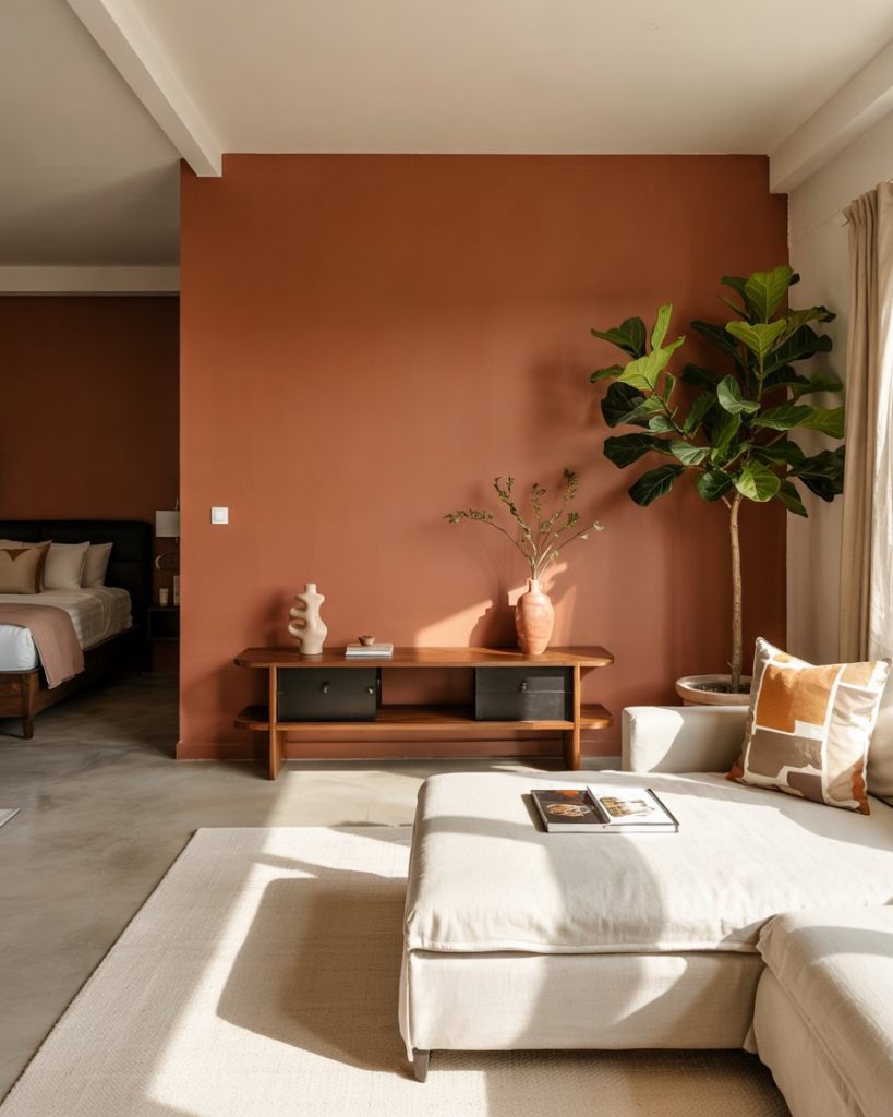 If your space follows a rectangular layoutof about 450 sq ft, play with geometry and color. Place your sofa and media setup along one long wall, the bed opposite, and use a low console divider to define zones subtly. Add a bold accent wall—perhaps deep olive or terracotta—to ground the open layout and bring depth to the tiny space. The result is dynamic, modern, and expressive.