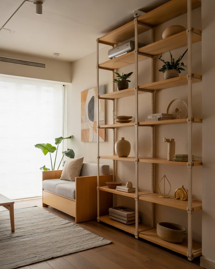 If your layout rectangle is 450 sq ft, focus on warm minimalism—simplicity softened with texture. A neutral palette with clay tones, wood accents, and subtle linen fabrics makes the tiny apartment inviting. A slim wooden divider defines areas gently, achieving both order and cozy calm.