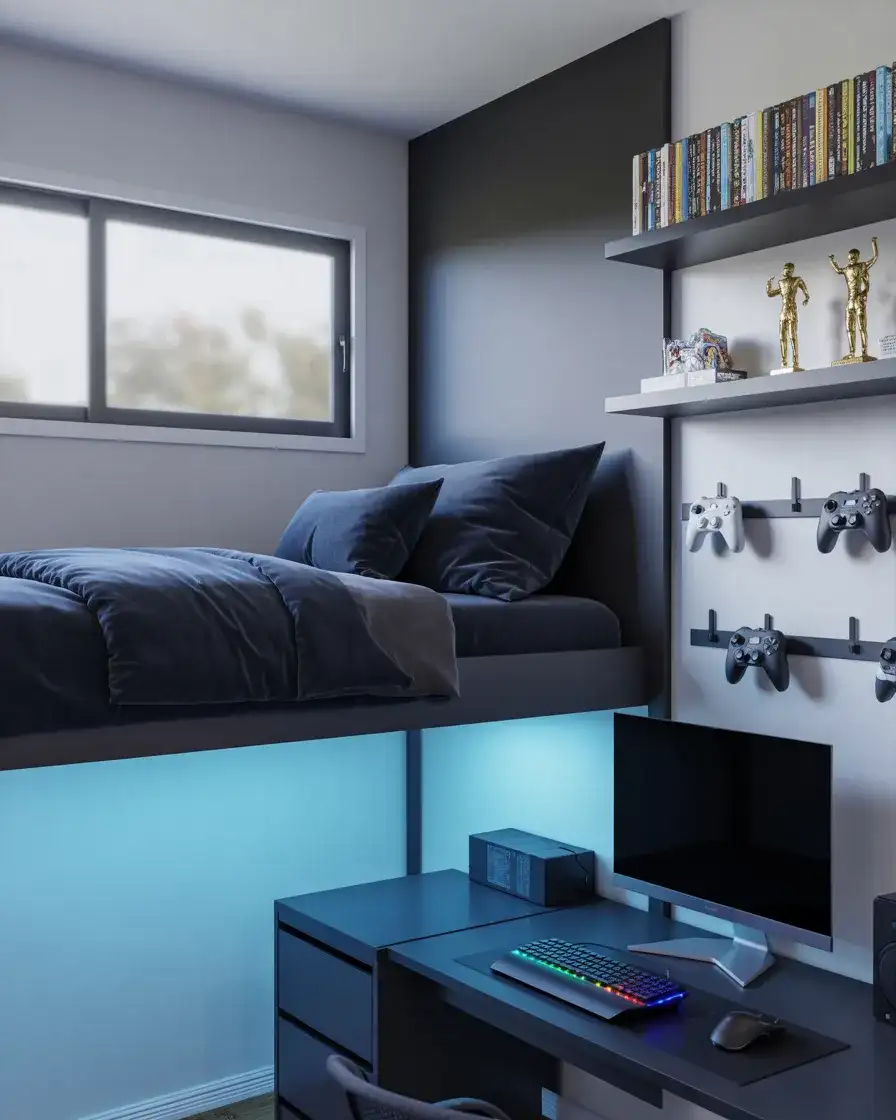 A loft bed with a built-in desk underneath is one of the most space-efficient moves you can make in a smaller bedroom. It separates the sleeping zone from the gaming zone both physically and psychologically—something that genuinely helps with sleep hygiene in kids who game at night. Many parents report that this simple spatial separation, more than any parental controls or rule-making, naturally encouraged their kids to stop gaming earlier in the evening.