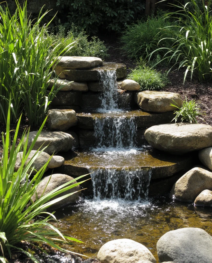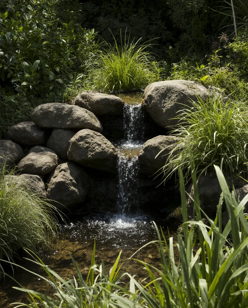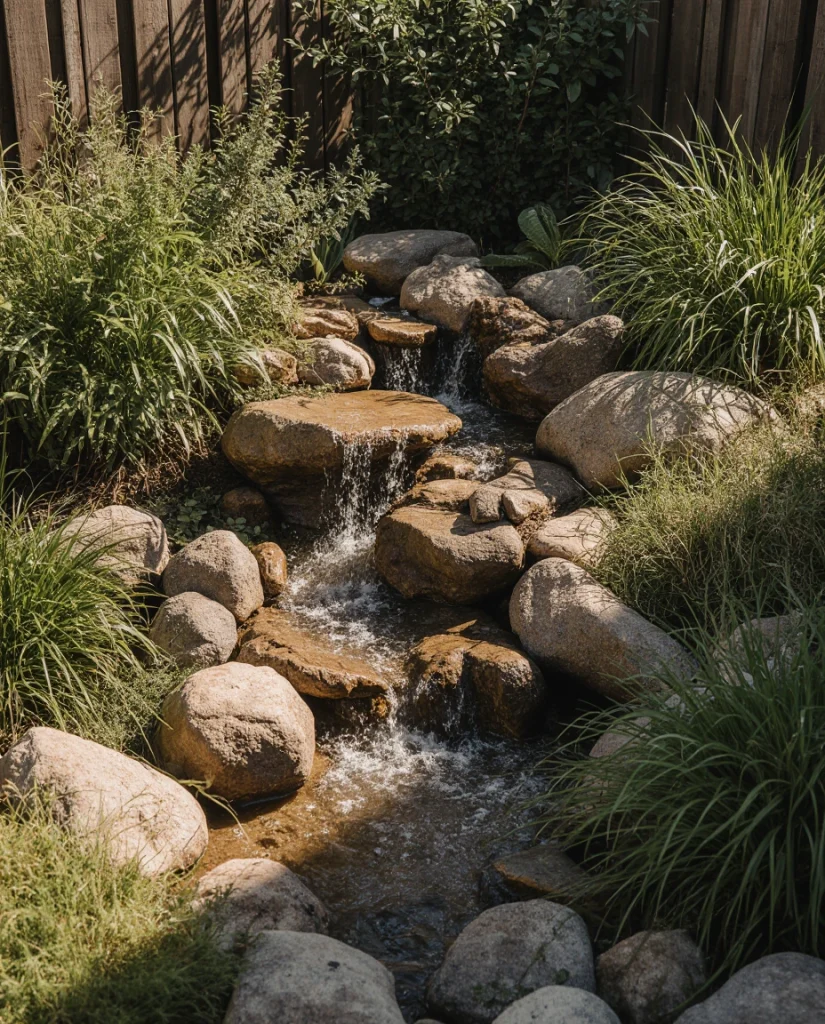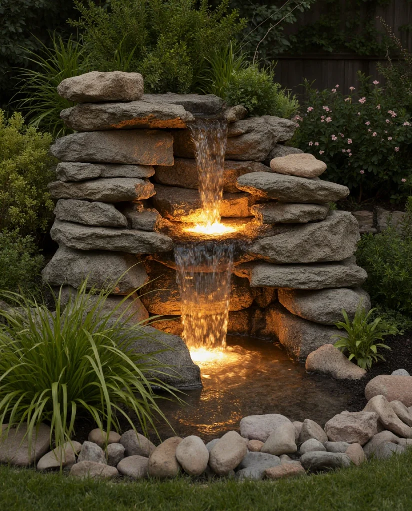 8. Mini Waterfall Garden for Compact Backyards