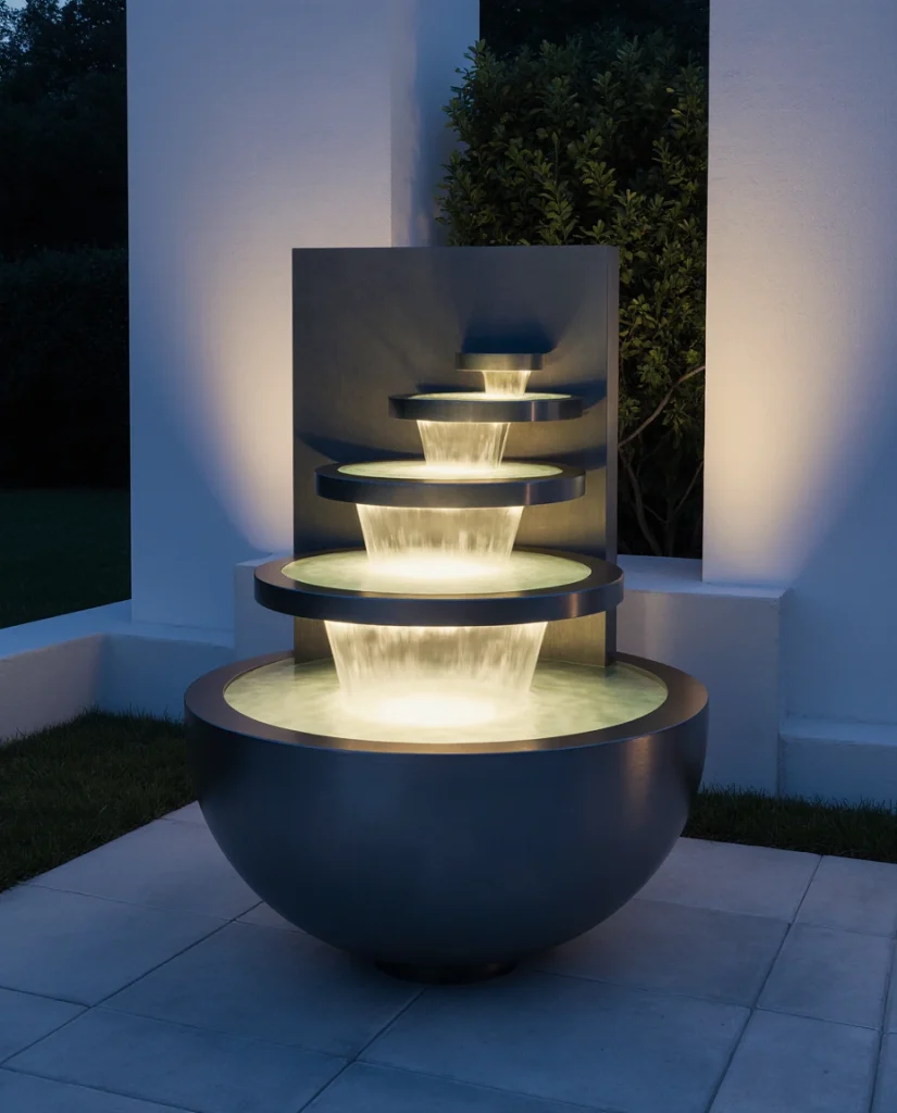 11. Contemporary Metal Bowl Fountain with LED Glow