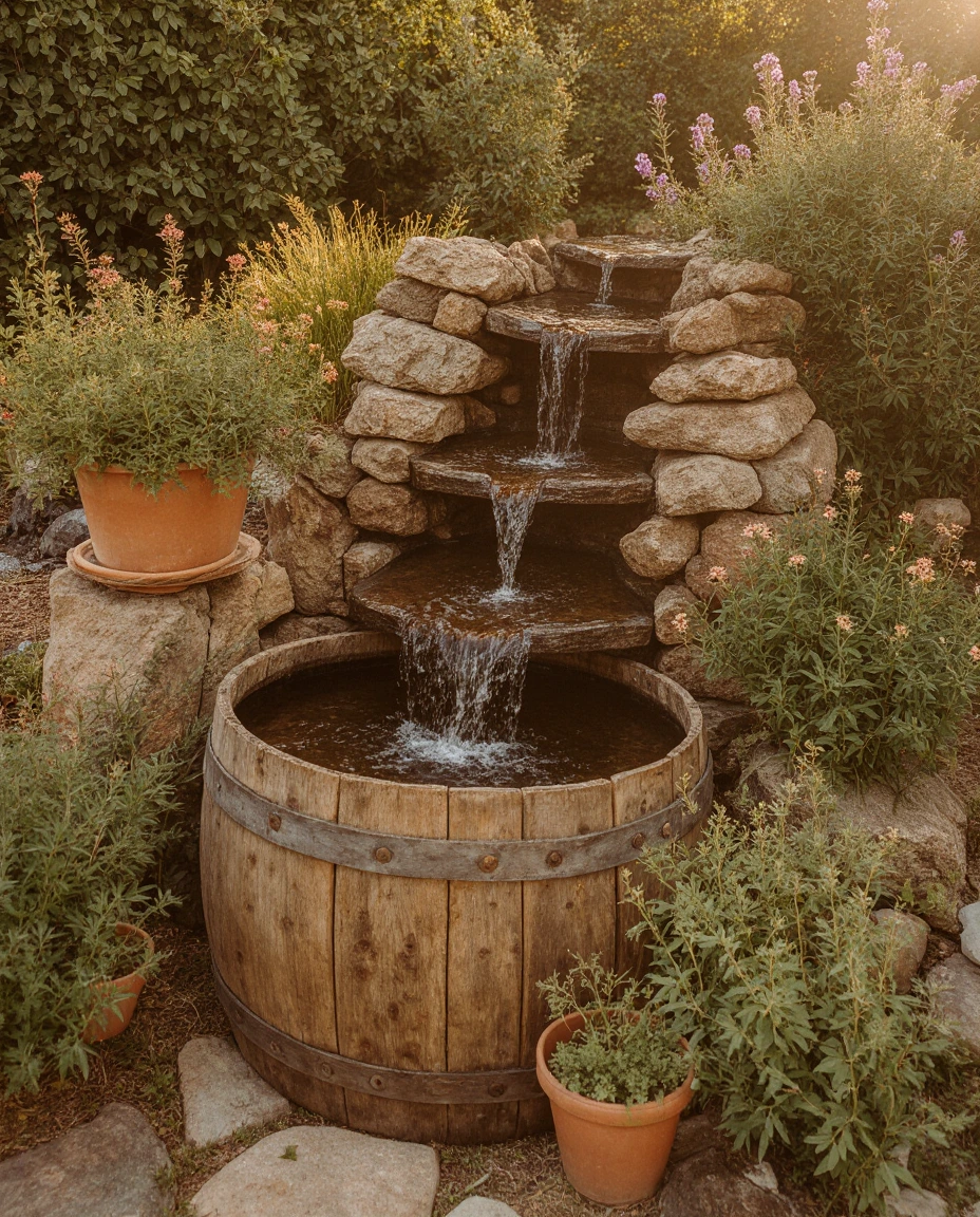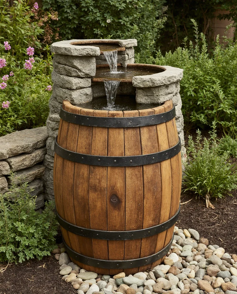 12. Rustic Barrel Fountain with Stone Accents