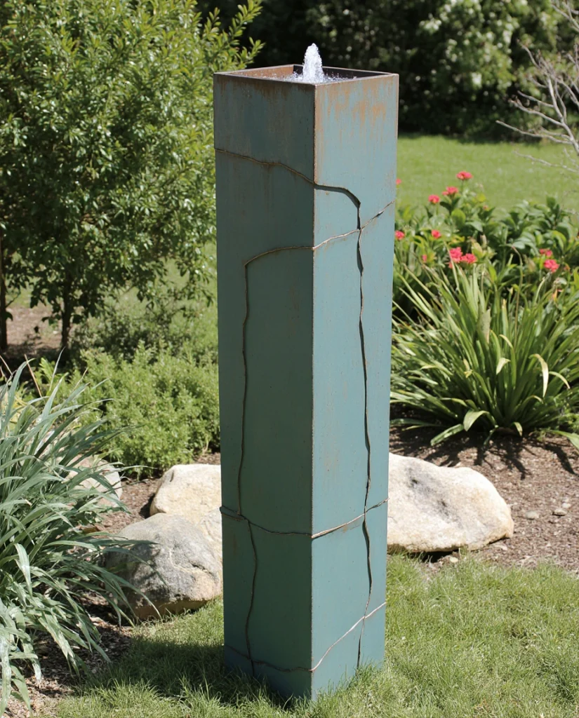 7. Tall Painted Metal Fountain for Artistic Exteriors